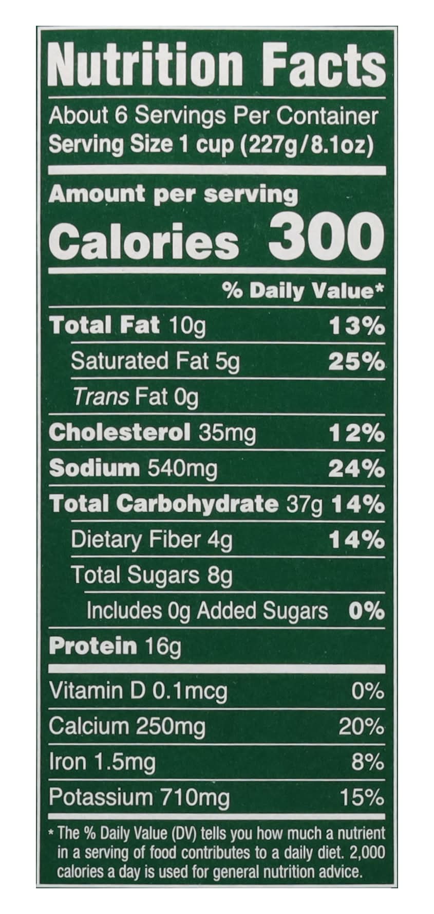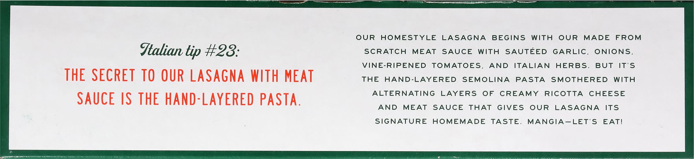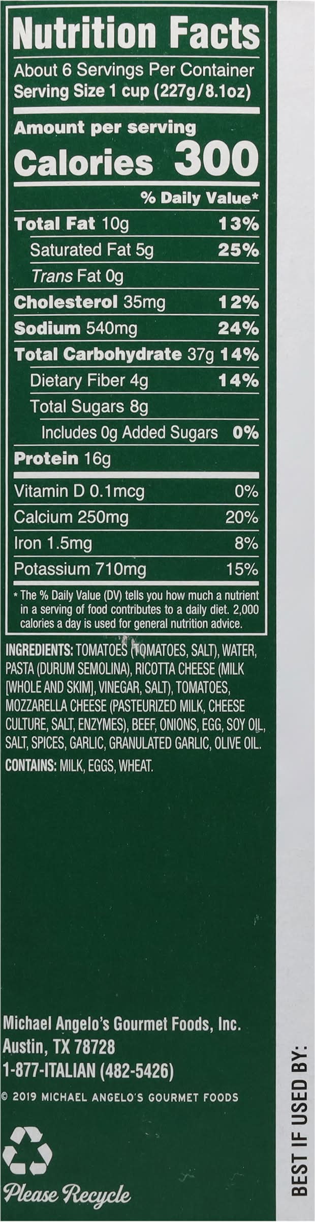 Ingredients: Tomatoes (Tomatoes, Salt), Water, Pasta (Durum Semolina), Ricotta Cheese (Milk [Whole and Skim], Vinegar, Salt), Tomatoes, Mozzarella Cheese (Pasteurized Milk, Cheese Culture, Salt, Enzymes), Beef, Onions, Egg, Soy Oil, Salt, Spices, Garlic, Granulated Garlic, Olive Oil Contains: Milk, Eggs, Wheat, Soybeans