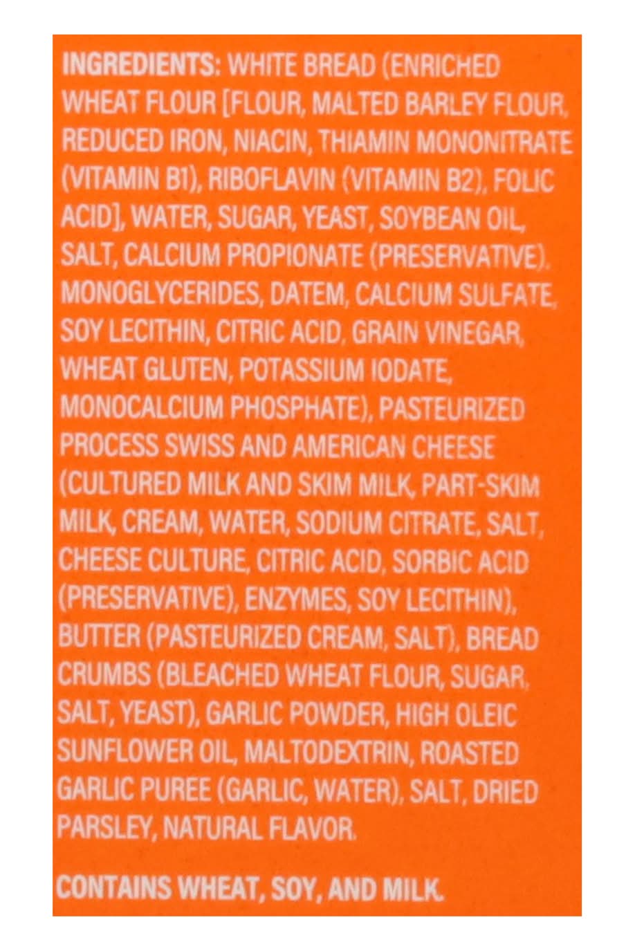 Ingredients: White Bread (Enriched Wheat Flour [Flour, Malted Barley Flour, Reduced Iron, Niacin, Thiamin Mononitrate (Vitamin B1), Riboflavin (Vitamin B2), Folic Acid], Water, Sugar, Yeast, Soybean Oil, Salt, Calcium Propionate (Preservative), Monoglycerides, DATEM, Calcium Sulfate, Soy Lecithin, Citric Acid, Grain Vinegar, Wheat Gluten, Potassium Iodate, Monocalcium Phosphate), Pasteurized Process Swiss and American Cheese (Cultured Milk and Skim Milk, Part-Skim Milk, Cream, Water, Sodium Citrate, Salt, Cheese Culture, Citric Acid, Sorbic Acid (Preservative), Enzymes, Soy Lecithin), Butter (Pasteurized Cream, Salt), Bread Crumbs (Bleached Wheat Flour, Sugar, Salt, Yeast), Garlic Powder, High Oleic Sunflower Oil, Maltodextrin, Roasted Garlic Puree (Garlic, Water), Salt, Dried Parsley, Natural Flavor Contains: Wheat, Barley, Soybeans, Gluten, Milk