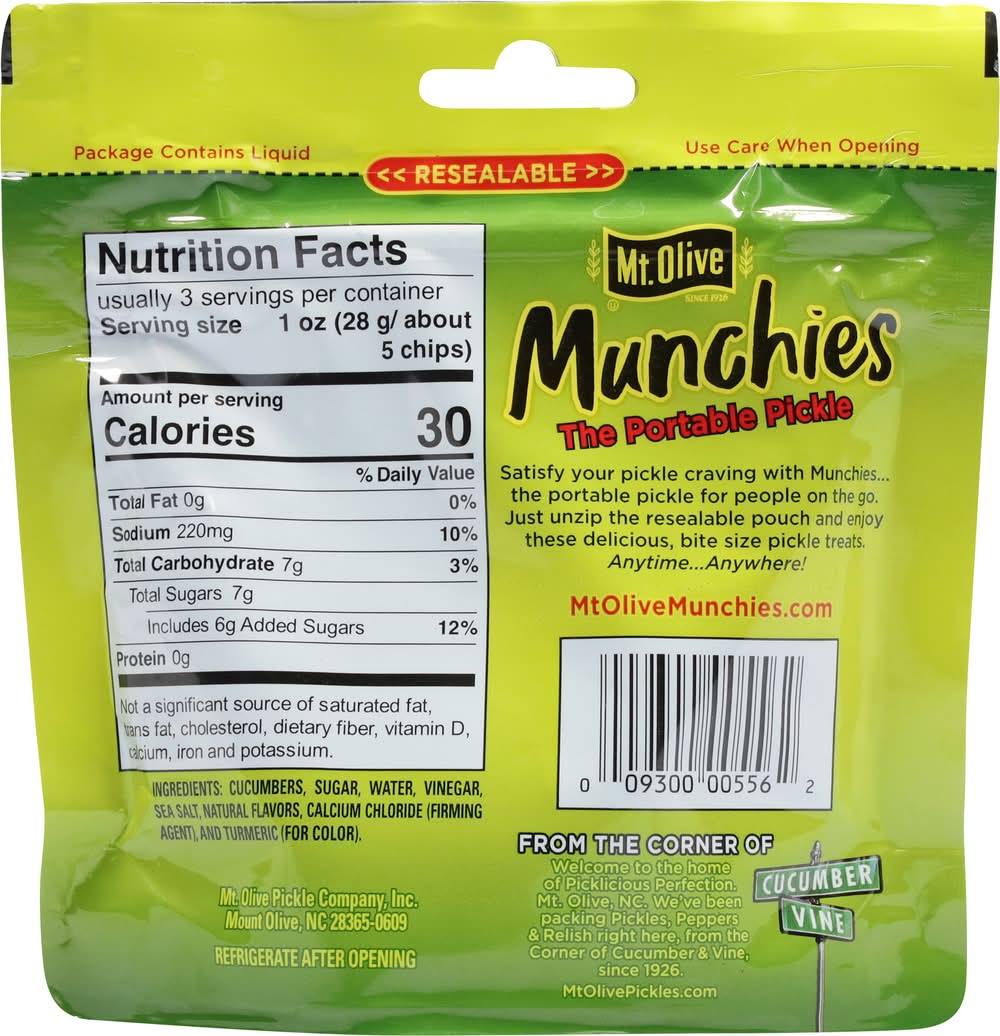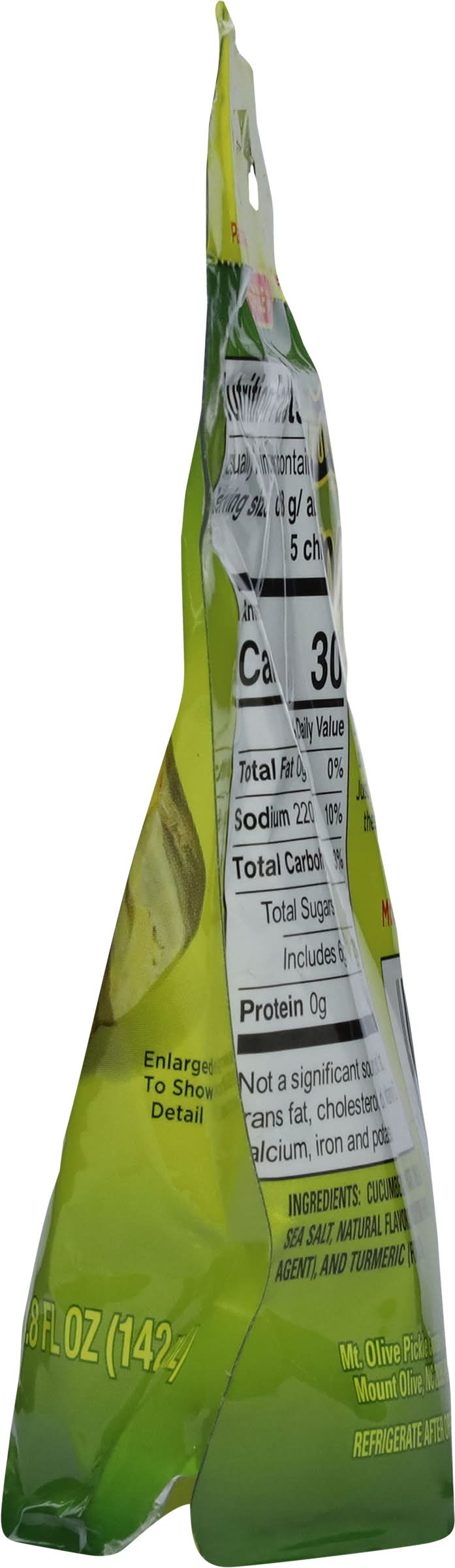 Ingredients: Cucumbers, Sugar, Water, Vinegar, Sea Salt, Natural Flavors, Calcium Chloride (Firming Agent), and Turmeric (for Color)
