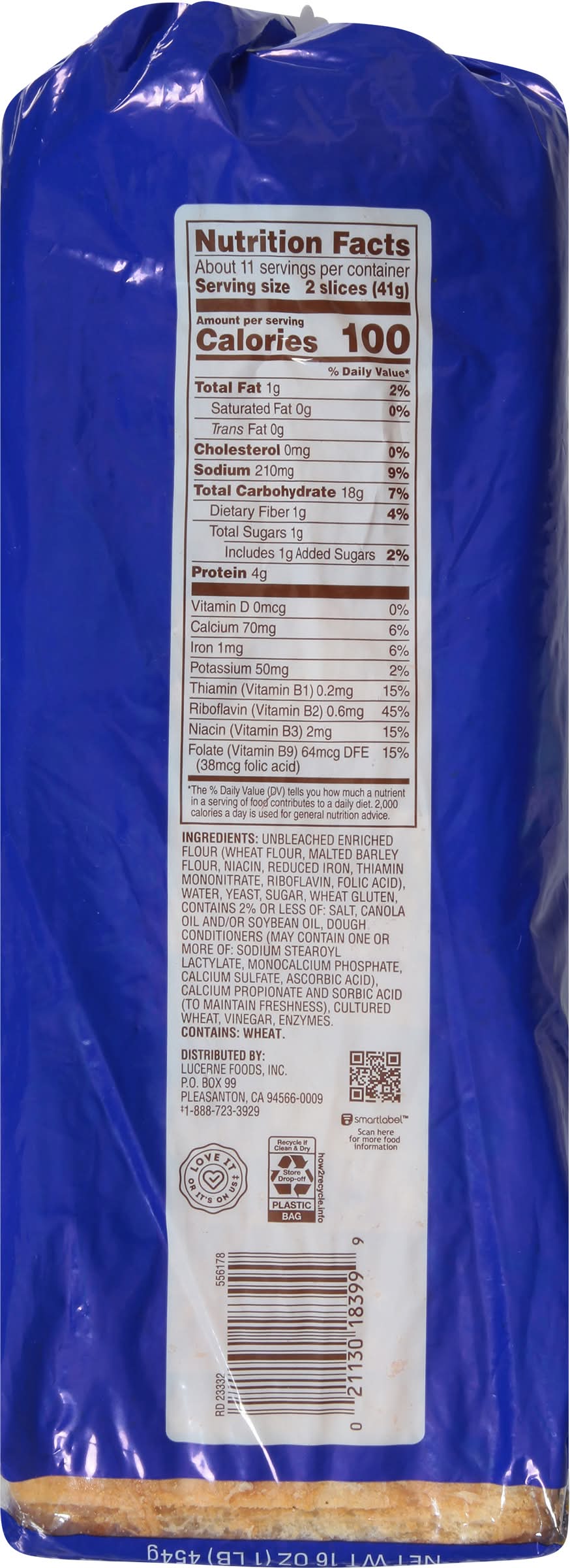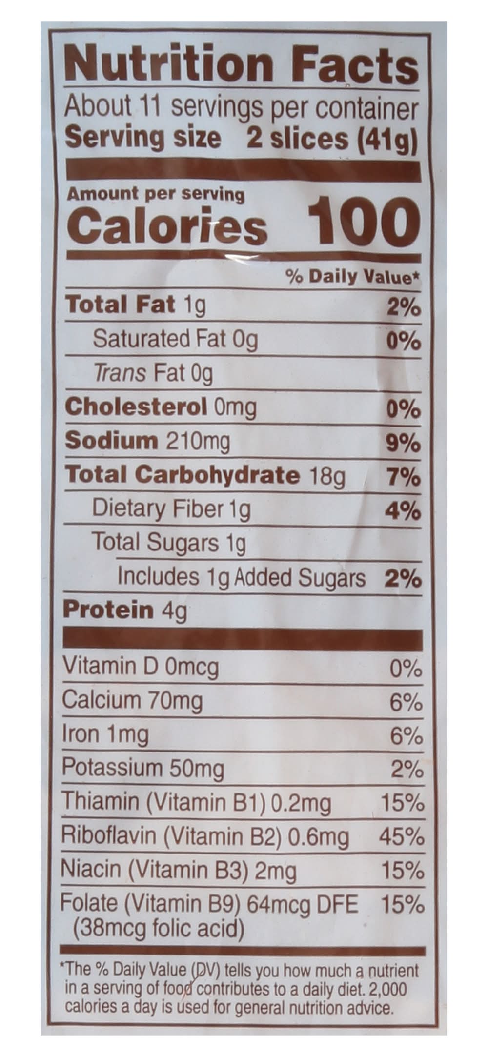 Ingredients: Unbleached Enriched Flour (Wheat Flour, Malted Barley Flour, Niacin, Reduced Iron, Thiamin Mononitrate, Riboflavin, Folic Acid), Water, Yeast, Sugar, Wheat Gluten, Contains 2% or Less of: Salt, Canola Oil and/or Soybean Oil, Dough Conditioners (May Contain One or More of: Sodium Stearoyl Lactylate, Monocalcium Phosphate, Calcium Sulfate, Ascorbic Acid), Calcium Propionate and Sorbic Acid (to Maintain Freshness), Cultured Wheat, Vinegar, Enzymes Contains: Wheat, Barley, Gluten