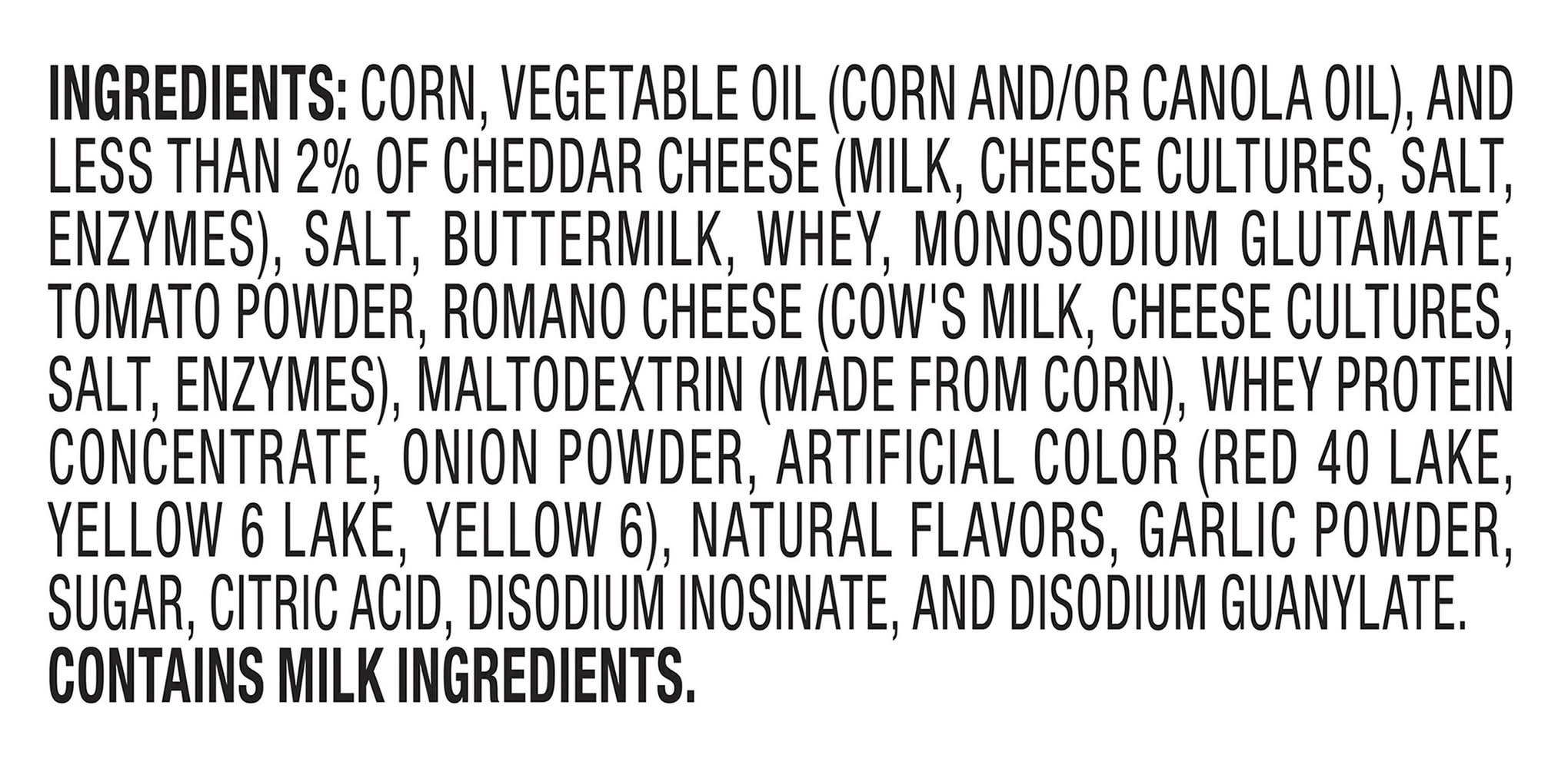 Ingredients: Corn, Vegetable Oil (Corn and/or Canola Oil), and Less than 2% of Cheddar Cheese (Milk, Cheese Cultures, Salt, Enzymes), Salt, Buttermilk, Whey, Monosodium Glutamate, Tomato Powder, Romano Cheese (Cow's Milk, Cheese Cultures, Salt, Enzymes), Maltodextrin (Made from Corn), Whey Protein Concentrate, Onion Powder, Artificial Color (Red 40 Lake, Yellow 6 Lake, Yellow 6), Natural Flavors, Garlic Powder, Sugar, Citric Acid, Disodium Inosinate, and Disodium Guanylate Contains: Milk