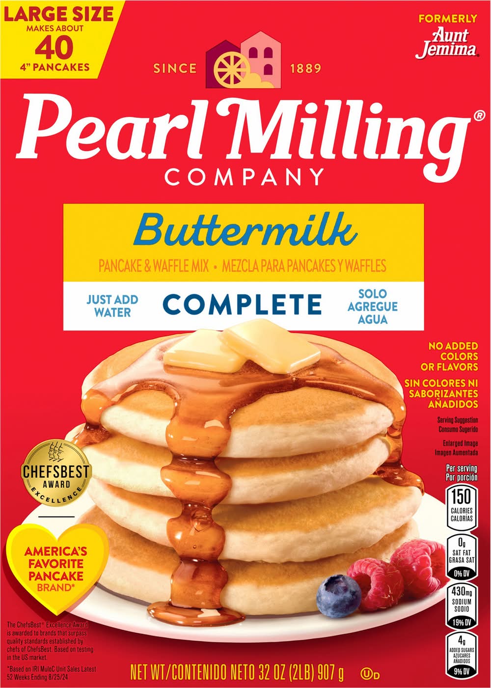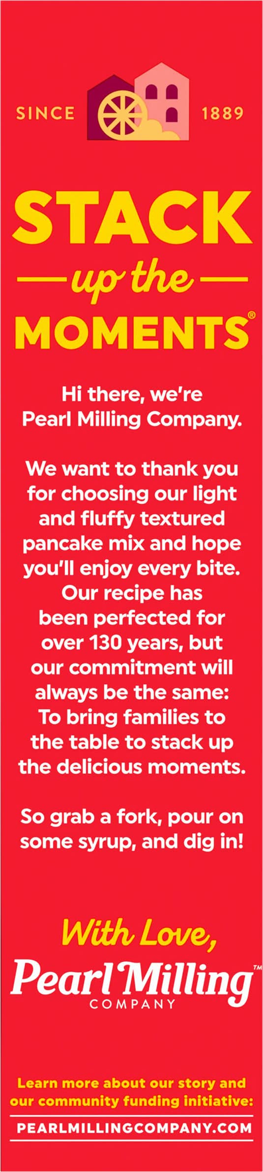 Safe handling instructions: pancake mix is made with raw flour so it is not ready-to-eat and must be thoroughly cooked before eating to prevent illness from bacteria in the flour. do not eat or play with raw dough; wash hands, utensils, and surfaces after handling. waffle: heat waffle iron. combine 2 cups pearl milling company mix, 1-1/2 cups water and 1/3 cup oil; stir until large lumps disappear. for best results, allow batter to rest 4-5 minutes before baking. pour desired amount of batter into lightly greased waffle iron. bake until steaming stops. makes twelve 4 inches waffles. pancakes: makes 12 four-inch pancakes. 2 cups dry mix. 1-1/2 cups water. (1) heat skillet over medium-low heat or electric griddle to 375 degrees f. (2) combine all ingredients and stir until large lumps disappear (do not beat or over-mix). let stand 1-2 minutes to thicken. (3) pour slightly less than 1/4 cup batter for each pancake onto lightly greased skillet. tip: for golden brown pancakes, use solid shortening instead of oil, butter, or margarine. (4) cook for 90 seconds on first side. turn, and cook for another 60 seconds. tip: for soft and fluffy pancakes, avoid turning them more than once. single serving directions (two 4-inches pancakes): use 1/3 cup mix and 1/4 cup water. to open: lift tab and pull. to close: tuck red tab in. lift here tuck in to close.