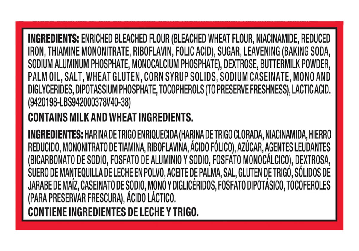 Ingredients: Enriched Bleached Flour (Bleached Wheat Flour, Niacinamide, Reduced Iron, Thiamine Mononitrate, Riboflavin, Folic Acid), Sugar, Leavening (Baking Soda, Sodium Aluminum Phosphate, Monocalcium Phosphate), Dextrose, Buttermilk Powder, Palm Oil, Salt, Wheat Gluten, Corn Syrup Solids, Sodium Caseinate, Mono and Diglycerides, Dipotassium Phosphate, Tocopherols (to Preserve Freshness), Lactic Acid Contains: Milk, Wheat