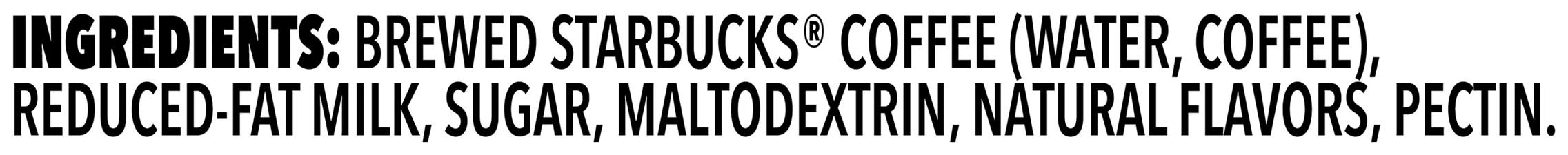 Ingredients: Brewed Starbucks Coffee (Water, Coffee), Reduced-Fat Milk, Sugar, Maltodextrin, Natural Flavors, Pectin Contains: Milk Contains 110mg of caffeine