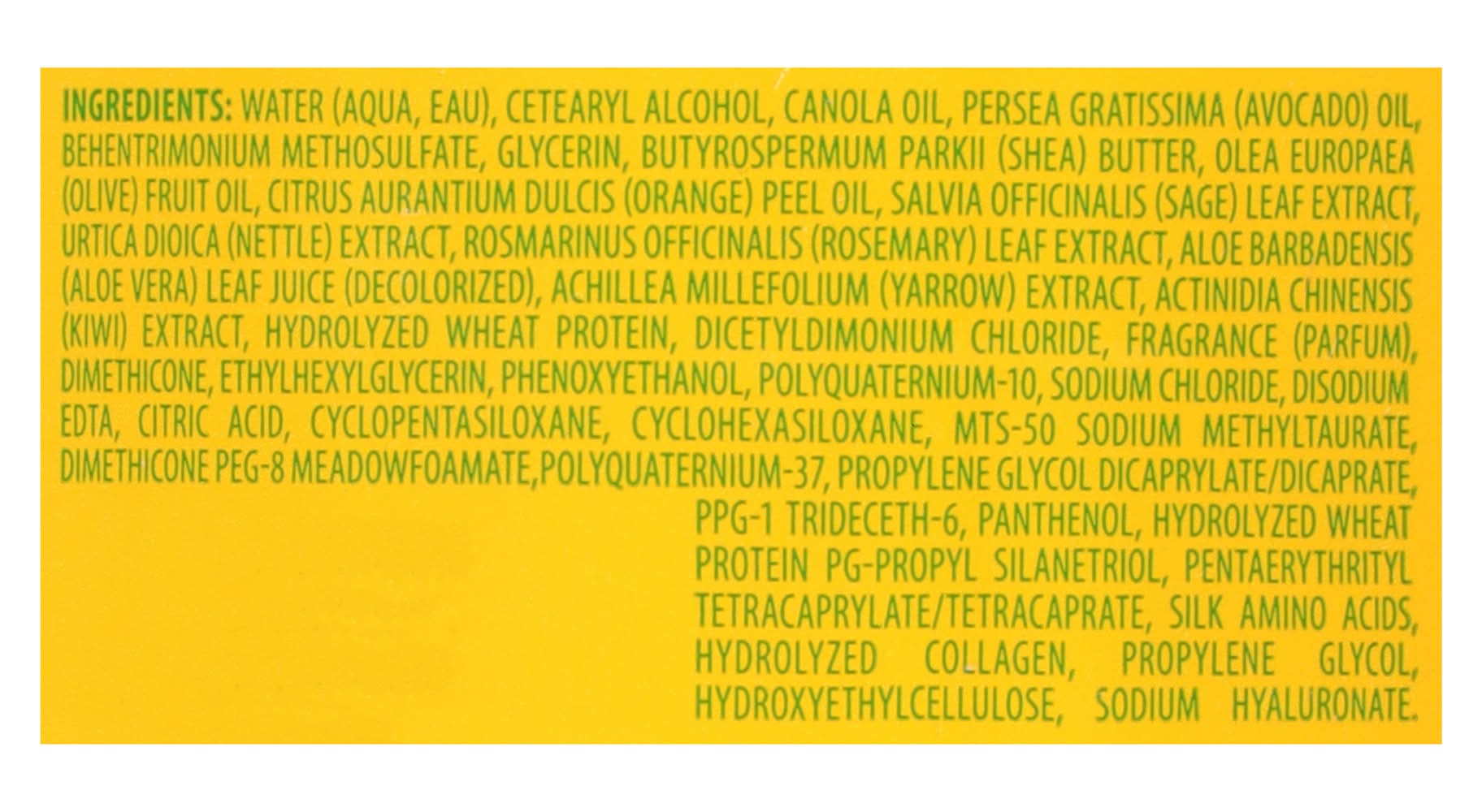 Ingredients: Water (Aqua, Eau), Cetearyl Alcohol, Canola Oil, Persea Gratissima (Avacado) Oil, Behentrimonium Methosulfate, Glycerin, Butyrospremum Parkii (Shea) Butter, Olea Europea (Olive) Fruit Oil, Citrus Aurantium Dulcis (Orange) Peel Oil, Salvia Officinalis (Sage) Leaf Extract, Urticia Dioica (Nettle) Extract, Rosmarinus Officinalis (Rosemary) Leaf Extract, Aleo Barbadensis (Aloe Vera) Leaf Extract, Achillea Millefolium (Yarrow) Extract, Actinidia Chinensis (Kiwi) Extract, Hydrolyzed Wheat Protein, Dicetyldimonium Chloride, Fragrance (Parfum), Dimethicone, Ethylhexylglycerin, Phenoxyethanol, Polyquaternium-10, Sodium Chloride, Disodium EDTA, Citric Acid, Cyclopentasiloxane, Cyclohexasiloxane, MTS-50 Sodium Methyltaurate, Dimethicone PEG-8 Meadowfoamate, Polyquaternium-37, Propylene Glycol Dicaprate/Dicaprate, PPG-1 Tridecethote-6, Panthenol, Hydrolyzed Wheat Protein PG-Propyl Silanetriol, Pentaeryhthrytyl Tetracaprylate/Tetracaprate, Silk Amino Acids, Hydrolyzed Collagen, Propylene Glycol, Hydroxyethylcellulose, Sodium Hyaluronate Contains: Tree Nuts, Sheanuts, Wheat