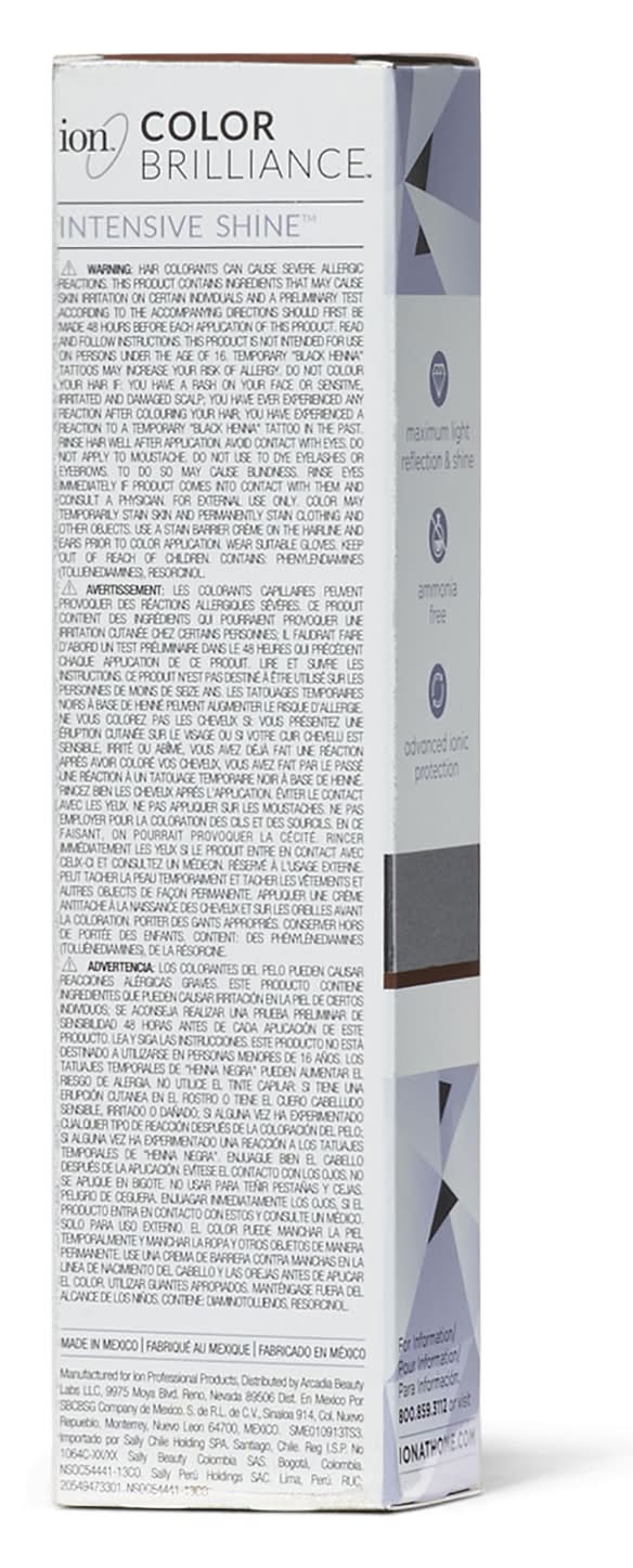 It is a state-of-the-art, European Ionic Formula that is a luxurious, long-lasting, deposit-only hair color without ammonia. This hair color covers and blends gray hair up to 100% without lifting the hair's natural pigment. The formula will allow same-day color with chemical relaxers and permanent waves. ion Hair Color’s superior quality, proprietary blends are formulated in Italy by our expert team of chemists to deliver unparalleled results. Our unique system combines the finest quality natural and exotic ingredients with powerful high-tech compounds to achieve exquisite, brilliant color with superior gray coverage. ion Hair Color science relies on the power of micro-pigmentation—our microscopic pigment molecules oxidize slower, allowing them to penetrate deep into the cortex of each hair strand for long-lasting, fade-resistant color. ion's formulas are PPD-free and enriched with Hyaluronic Acid, Argan Oil, Pequi Oil, and botanicals to nourish and strengthen hair from within. Not to mention, ion Hair Color is gentle on hair. Unlock your hair’s true potential with ion’s cutting-edge, salon-quality color science and bring home vibrancy like never before. It provides protection for stronger hair structure. It contains botanically derived nourishing ingredients with a refreshing fragrance. • Color: 3w dark warm brown • Size: 2.05