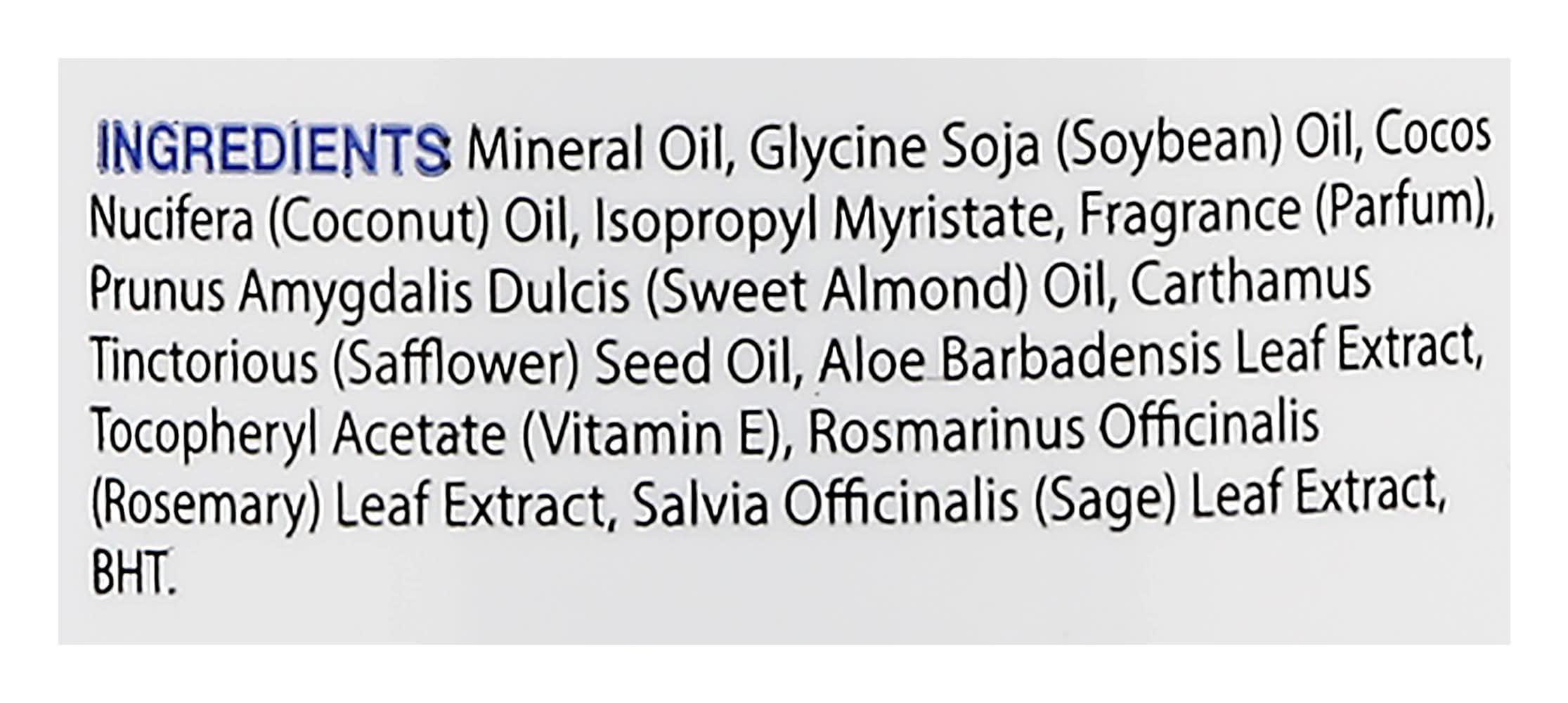 Ingredients: Mineral Oil, Glycine Soja (Soybean) Oil, Cocos Nucifera (Coconut) Oil, Isopropyl Myristate, Fragrance (Parfum), Prunus Amygdalis Dulcis (Sweet Almond) Oil, Carthamus Tinctorious (Safflower) Seed Oil, Aloe Barbadensis Leaf Extract, Tocopheryl Acetate (Vitamin E), Rosmarinus Officinalis (Rosemary) Leaf Extract, Salvia Officinalis (Sage) Leaf Extract, BHT Contains: Soybeans, Tree Nuts, Almonds, Tree Nuts, Coconuts