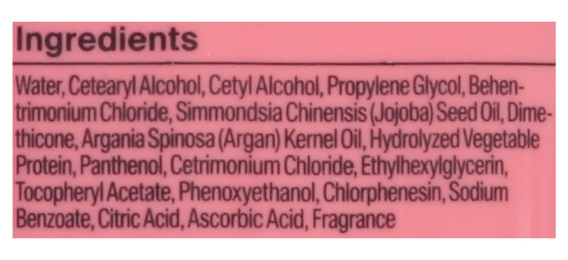 Ingredients: Water, Cetearyl Alcohol, Cetyl Alcohol, Propylene Glycol Behentrimonium Chloride, Simmondsia Chinensis (Jojoba) Seed Oil, Dimethicone, Argania Spinosa (Argan) Kernel Oil, Hydrolyzed Vegetable Protein, Panthenol, Cetrimonium Chloride, Ethylhexylglycerin, Tocopheryl Acetate, Phenoxyethanol, Chlorphenesin, Sodium Benzoate, Citric Acid, Ascorbic Acid, Fragrance