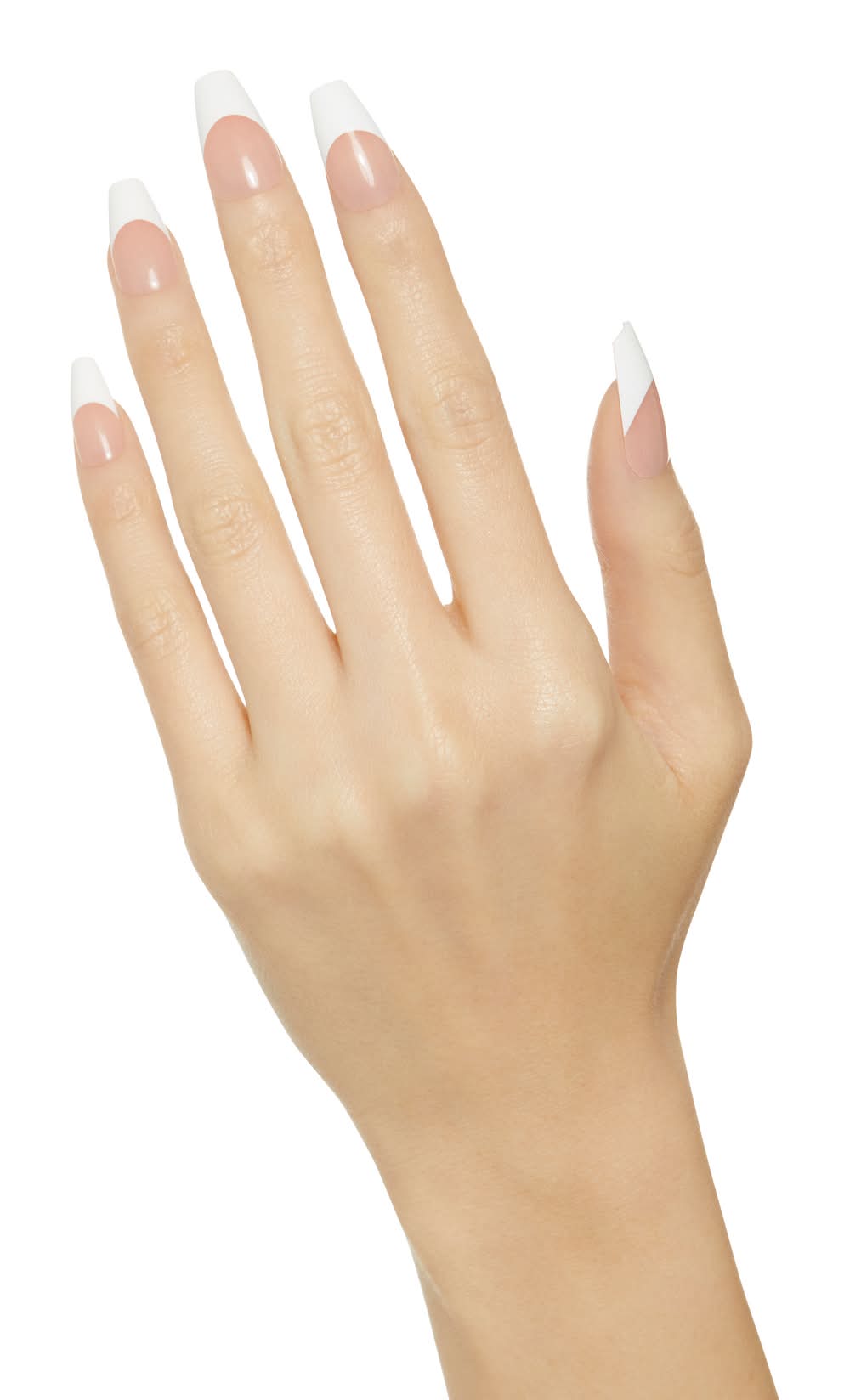 Revolutionary French nails. Flexi-Fit Technology: Flexible nails feel comfortable, fit right, last longer. Flexi-fit technology. Ultra flexible, flawless fit. No bubbles. Glue included. Quality products that deliver salon results. Durable strength, comfortable wear. Acrylic-infused technology. At Cuticle: Snug fit, 25% thinner than other brands. Nail Bed: Flexible fit delivers lasting comfort. • Size: M • Kiss Products Inc, Port Washington,NY,11050