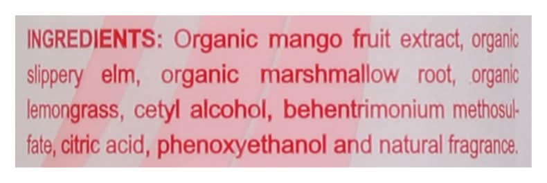 Ingredients: Organic Mango Fruit Extract, Organic Slippery Elm, Organic Marshmallow Root, Organic Lemongrass, Cetyl Alcohol, Behentrimonium Methosulefate, Citric Acid, Phenoxyethanol and Natural Fragrance