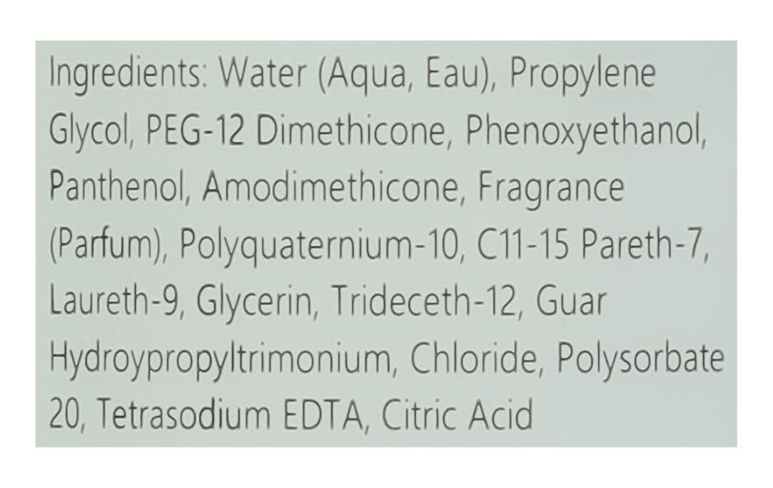 Ingredients: Water (Aqua, Eau), Propylene Glycol, PEG-12 Dimethicone, Phenoxyethanol, Panthenol, Amodimethicone, Fragrance (Parfum), Polyquaternium-10, C11-15 Pareth-7, Laureth-9, Glycerin, Trideceth-12, Guar Hydroypropyltrimonium, Chloride, Polysorbate 20, Tetrasodium EDTA, Citric Acid