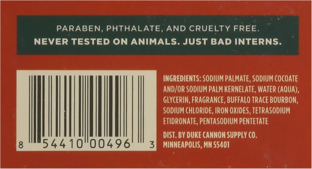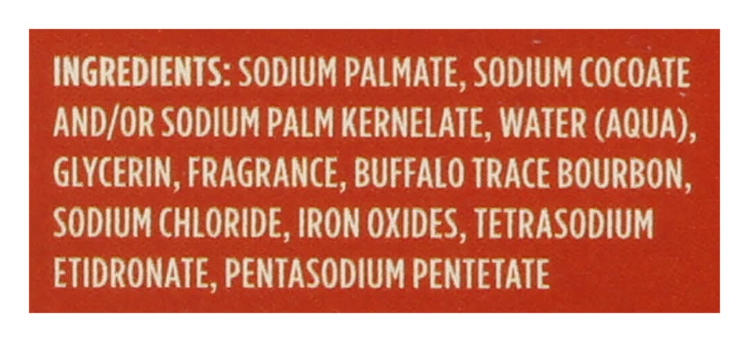 Ingredients: Sodium Palmate, Sodium Cocoate and/or Sodium Palm Kernelate, Water (Aqua), Glycerin, Fragrance, Buffalo Trace Bourbon, Sodium Chloride, Iron Oxides, Tetrasodium Etidronate, Pentasodium Pentetate