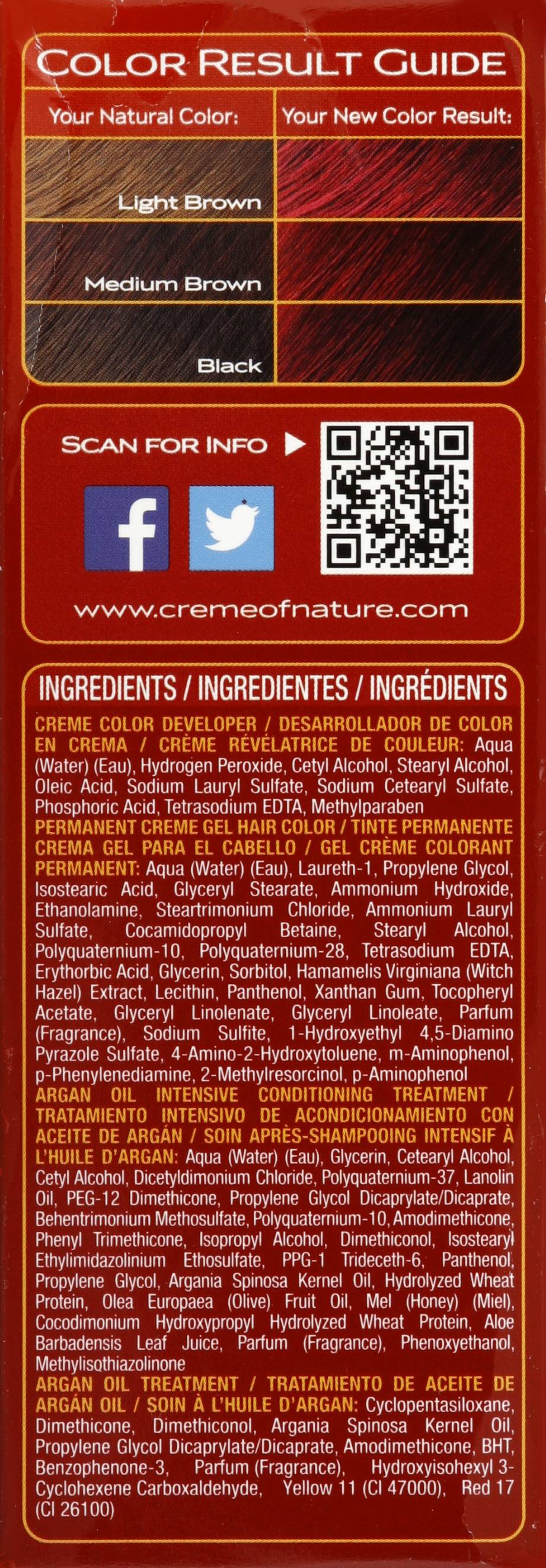 Ingredients: Creme Color Developer: Aqua (Water) (Eau), Hydrogen Peroxide, Cetyl Alcohol, Stearyl Alcohol, Oleic Acid, Sodium Lauryl Sulfate, Sodium Cetearyl Sulfate, Phosphoric Acid, Tetrasodium EDTA, Methylparaben. Permanent Creme Gel Hair Color: Aqua (Water) (Eau), Laureth-1, Propylene Glycol, Isostearic Acid, Glyceryl Stearate, Ammonium Hydroxide, Ethanolamine, Steartrimonium Chloride, Ammonium Lauryl Sulfate, Cocamidopropyl Betaine, Stearyl Alcohol, Polyquaternium-10, Polyquaternium-28, Tetrasodium EDTA, Erythorbic Acid, Glycerin, Sorbitol, Hamamelis Virginiana (Witch Hazel) Extract, Lecithin, Panthenol, Xanthan Gum, Tocopheryl Acetate, Glyceryl Linolenate, Glyceryl Linoleate, Parfum (Fragrance), Sodium Sulfite, 1-Hydroxyethyl 4, 5-Diamino Pyrazole Sulfate, 4-Amino-2-Hydroxytoluene, m-Aminophenol, p-Phenylenediamine, 2-Methylresorcinol, p-Aminophenol. Argan Oil Intensive Conditioning Treatment: Aqua (Water) (Eau), Glycerin, Cetearyl Alcohol, Cetyl Alcohol, Dicetyldimonium Chloride, Polyquaternium-37, Lanolin Oil, PEG-12 Dimethicone, Propylene Glycol Dicaprylate/Dicaprate, Behentrimonium Methosulfate, Polyquaternium-10, Amodimethicone, Phenyl Trimethicone, Isopropyl Alcohol, Dimethiconol, Isostearyl Ethylimidazolinium Ethosulfate, PPG-1 Trideceth-6, Panthenol, Propylene Glycol, Argania Spinosa Kernel Oil, Hydrolyzed Wheat Protein, Olea Europaea (Olive) Fruit Oil, Mel (Honey) (Miel), Cocodimonium Hydroxypropyl Hydrolyzed Wheat Protein, Aloe Barbadensis Leaf Juice, Parfum (Fragrance), Phenoxyethanol, Methylisothiazolinone. Argan Oil Treatment: Cyclopentasiloxane, Dimethicone, Dimethiconol, Argania Spinosa Kernel Oil, Propylene Glycol Dicaprylate/Dicaprate, Amodimethicone, BHT, Benzophenone-3, Parfum (Fragrance), Hydroxyisohexyl 3-Cyclohexene Carboxaldehyde Yellow 11 (CI 47000), Red 17 (CI 26100)