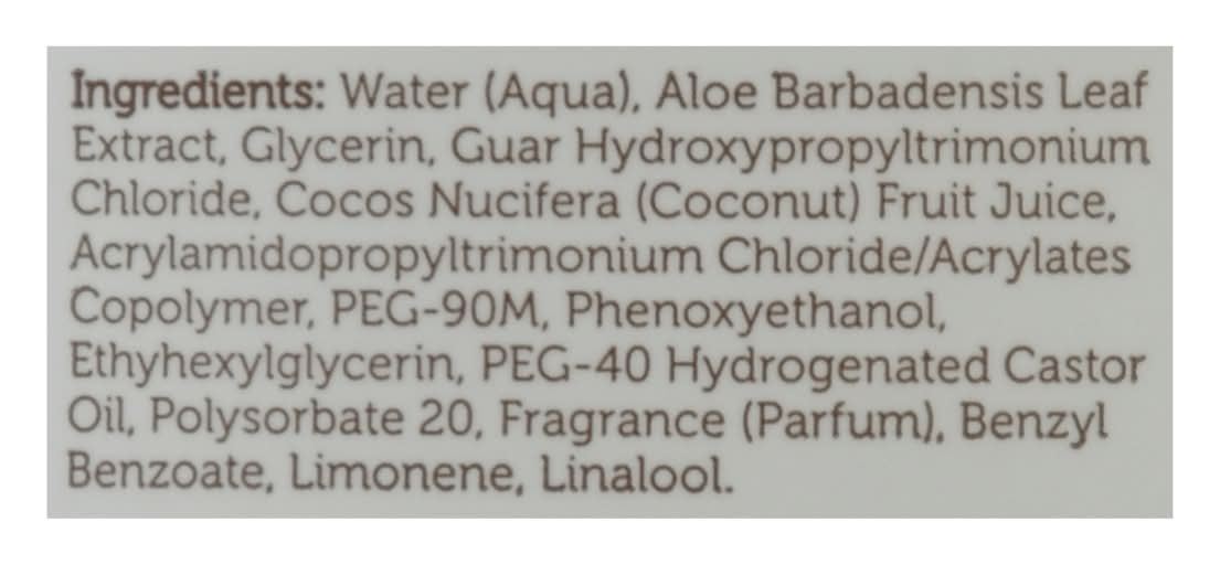Ingredients: Water (Aqua), Aloe Barbadensis Leaf Extract, Glycerin, Guar Hydroxypropyltrimonium Chloride, Cocos Nucifera (Coconut) Fruit Juice, Acrylamidopropyltrimonium Chloride/Acrylates Copolymer, PEG-90M, Phenoxyethanol, Ethyhexylglycerin, PEG-40 Hydrogenated Castor Oil, Polysorbate 20, Fragrance (Parfum), Benzyl Benzoate, Limonene, Linalool Contains: Tree Nuts