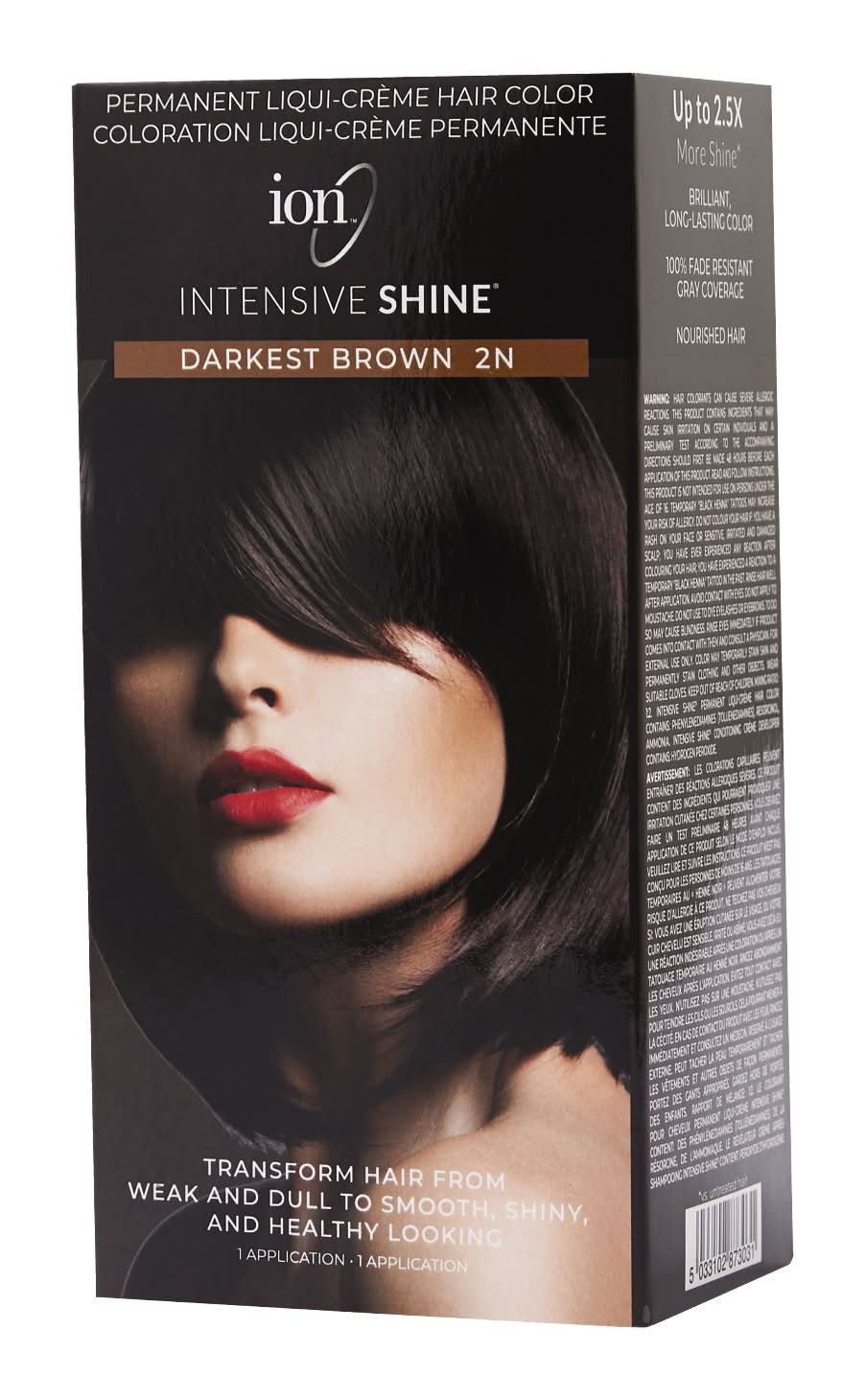 Intensive Shine has been formulated to provide maximum shine using a proprietary blend of Moroccan Argan, Tahitian Tamanu, Camellia, and Coconut oils. This unique blend of precious oils provides brilliant color while helping to transform your hair from weak and dull to silky, shiny and natural. Transform hair from weak and dull to smooth, shiny, and healthy. Brilliant, long-lasting color. 100% fade resistant gray coverage. Non-Drip liqui-creme formula is easily applied. Pleasant fragrance. Complete kit contains: hair color, pre-filled applicator bottle with ion Sensitive Scalp Crème Developer, pre-color treatment, after color treatment, gloves, and step by step instructions. Color: Darkest brown 2n