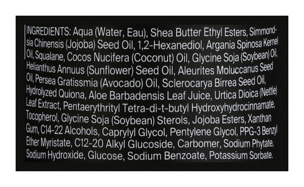 Ingredients: Aqua (Water, Eau), Shea Butter Ethyl Esters, Simmondsia Chinensis (Jojoba) Seed Oil, 1.2-Hexanediol, Argania Spinosa Kemel Oil, Squalane, Cocos Nucifera (Coconut) Oil, Glycine Soja (Soybean) Oil, Helianthus Annuus (Sunflower) Seed Oil, Aleurites Moluccanus Seed Oil, Persea Gratissmia (Avocado) Oil, Sclerocarya Birrea Seed Oil, Hydrolyzed Quiona, Aloe Barbadensis Leaf Juice, Urtica Dioica (Nettle) Leaf Extract, Pentaerythrityl Tetra-Di-T-Butyl Hydroxyhydrocinnamate, Tocopherol, Glycine Soja (Soybean) Sterols, Jojoba Esters, Xanthan Gum, C14-22 Alcohols, Caprylyl Glycol, Pentylene Glycol, PPG-3 Benzyl Ether Myristate, C12-20 Alkyl Glucoside, Carbomer, Sodium Phytate, Sodium Hydroxide, Glucose, Sodium Benzoate, Potassium Sorbate Contains: Tree Nuts, Argan Nuts, Soybeans