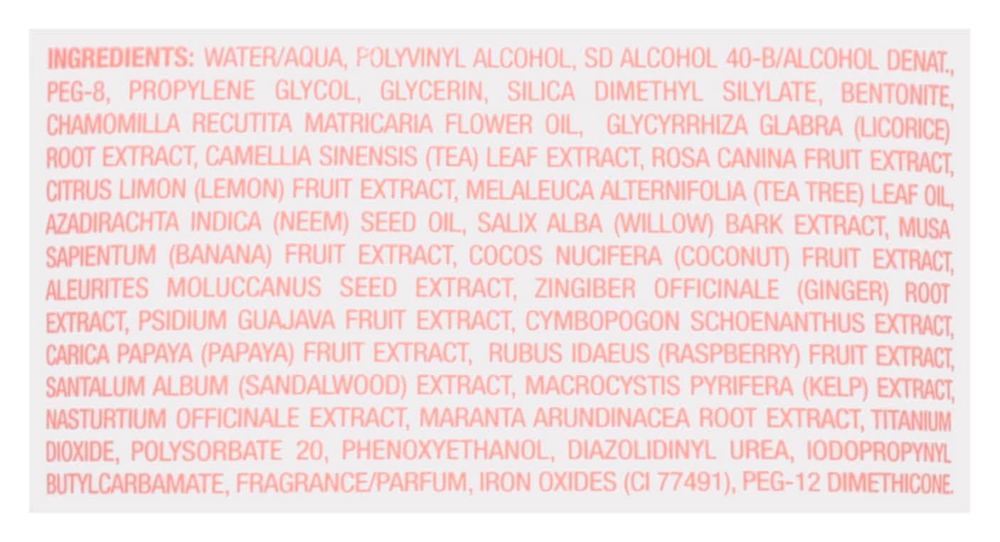 Ingredients: Water/Aqua, Polyvinyl Alcohol, SD Alcohol 40-B/Alcohol Denat. PEG-8, Propylene Glycol Glycerin, Silica Dimethyl Silylate, Bentonite Chamomilla Recutita Matricaria Flower Oil Giycyrrhiza Glabra (Licorice) Root Extract, Camellia Sinensis (Tea) Leaf Extract, Rosa Canina Fruit Extract Citrus Limon (Lemon) Fruit Extract, Melaleuca Alternifolia (Tea Tree) Leaf Oil Azadirachta Indica (Neem) Seed Oil Salix Alba (Willow) Bark Extract, Musa Sapientum (Banana) Fruit Extract, Cocos Nucifera (Coconut) Fruit Extract Aleurites Moluccanus Seed Extract, Zingiber Officinale (Ginger) Root Extract, Psidium Guajava Fruit Extract, Cymbopogon Schoenanthus Extract Carica Papaya (Papaya) Fruit Extract, Rubus Idaeus (Raspberry) Fruit Extract Santalum Album (Sandalwood) Extract, Macrocystis Pyrifera (Kelp) Extract, Nasturtium Officinale Extract, Maranta Arundinacea Root Extract, Titanium Dioxide, Polysorbate 20, Phenoxyethanol, Diazolidinyl Urea, Iodopropyny Butylcarbamate, Fragrance/Parfum, Iron Oxides (CI 77491), PEG-12 Dimethicone Contains: Tree Nuts, Coconuts, Tree Nuts