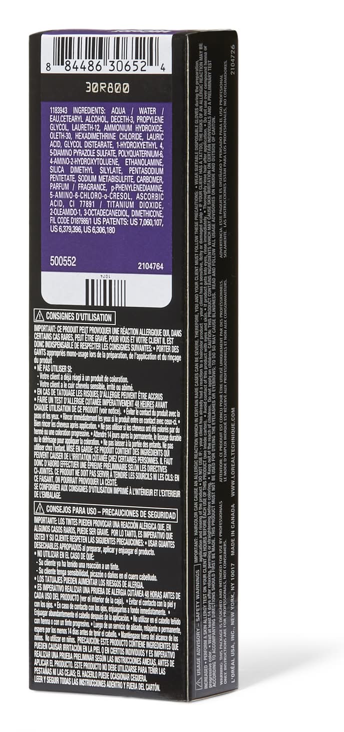 Excellence HiColor Violet and Black shades are new additions to the HiColor shade range featuring 3 Violet shades and 3 Black shades that deliver true to tone color results on dark bases of hair. The collection represents a new and unique shade pallet for HiColor and L’Oreal Technique and will appeal to new HiColor users seeking Violet, Blue, Plum hair color tones to add to their hair. HiColor is a Permanent hair color brand by L’Oreal Technique that is specifically formulated for dark bases of hair. All of the shades in the line provide multi-level lift on dark hair in one step with no brassiness. The shades are mixed in a 1:1.2 ratio with Oreor Crème Developer 30 volume. Processing time is 30 minutes at room temperature. • Color: H20 red violet • Size: 1.74