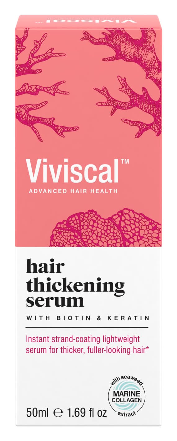 Viviscal Hair Thickening Serum is a lightweight leave-in treatment that coats each hair strand, creating multi-dimensional density without frizz and leading to thicker, fuller-looking hair. It is formulated with hair building blocks Biotin and Keratin, and fortified with Marine Collagen and Seaweed extract.