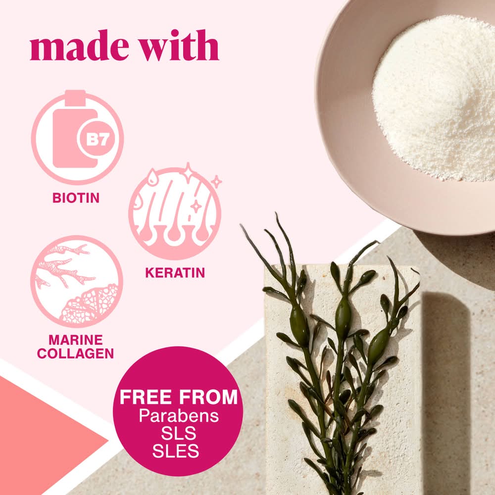 Ingredients: Active Ingredients: Biotin, Keratin, Marine Collagen, Seaweed Extract Inactive Ingredients: Aqua (Water), Alcohol Denat., Polysorbate 80, Benzyl Alcohol, Alcohol, Hydroxyethylcellulose, Polyamide-1, Parfum (Fragrance), CI 42090, Chlorphenesin, Soluble Collagen, Panthenol, Disodium EDTA, Pisum Sativum Sprout Extract, Hydrolyzed Keratin, Glycerin, Trisodium Ethylenediamine Disuccinate, Chondrus Crispus (Carrageenan), Extract, Fucus Vesiculosus Extract, Laminaria Digitata (Sea Kelp), Extract, Maris Sal (Sea Salt), Leuconostoc, Radish Root Ferment Filtrate, Biotin, Phenoxyethanol, Potassium Sorbate, Sodium Benzoate, Linalool, Hexyl Cinnamal, Limonene, Citronellol, Eugenol Contains: *N/A