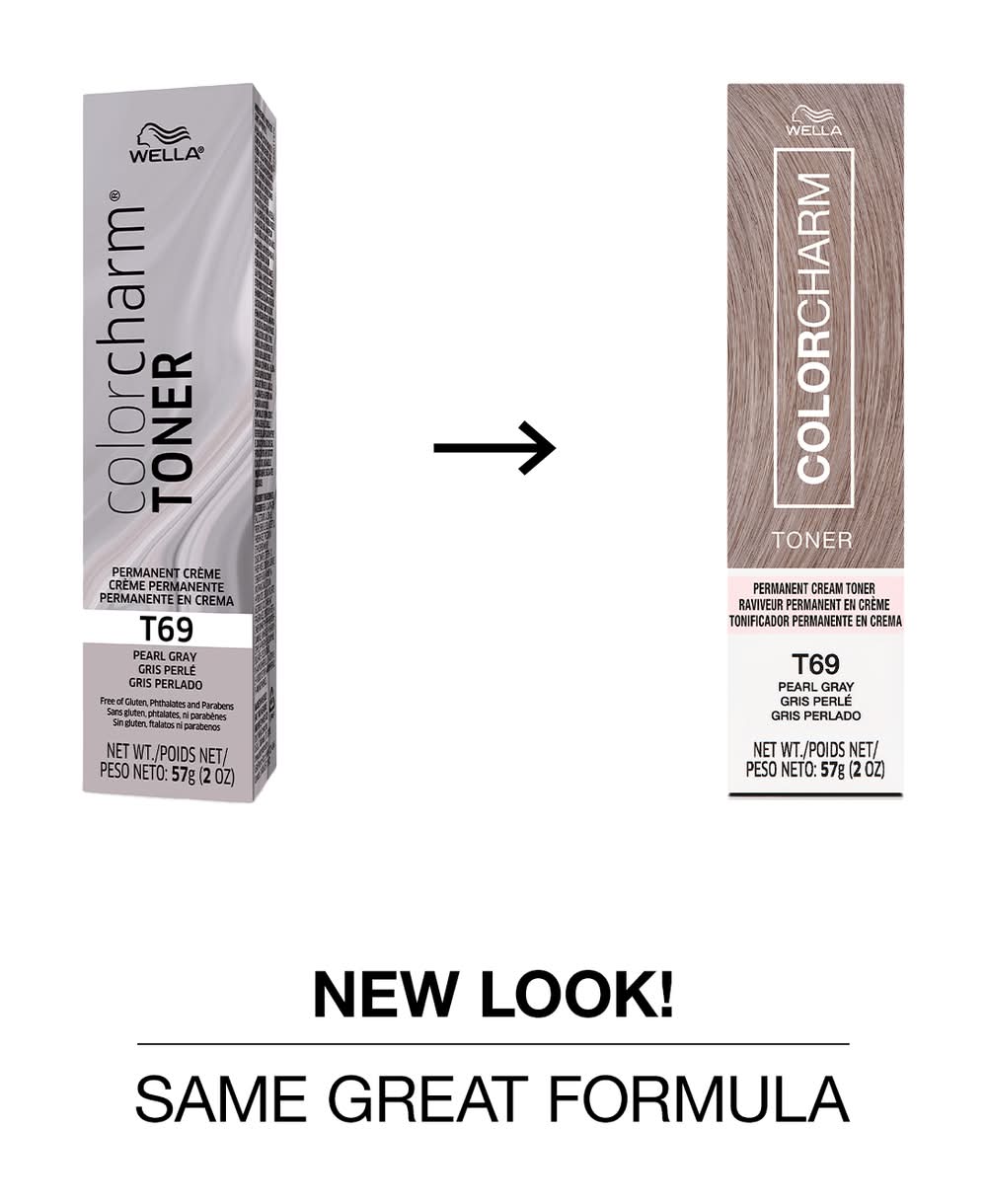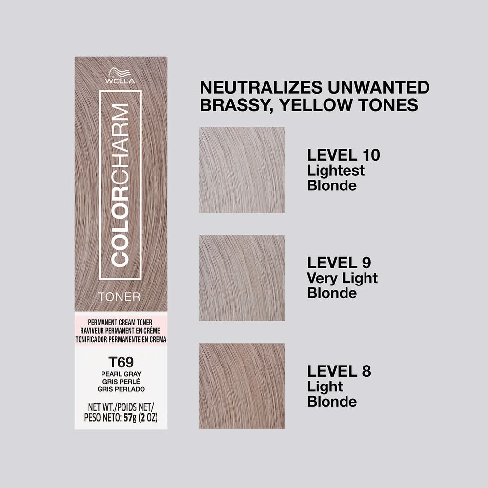 Discover your best blonde with new WELLA color charm Permanent Crème Toners. From the creators of the #1 permanent toner in the US, these 8 new crème toner shades let you neutralize brass and perfect your blonde with up to 90% less breakage. With a selection of 4 icy blonde tones and 4 pastel blonde tones, you now have the freedom to express your creativity with subtle to bold blonde looks and perfectly even tone from root to end. WELLA color charm liquid toner is the No.1 permanent toner in the US. WELLA calculation based on data reported by Nielsen IQ‘s Scan track Service for Permanent Toner Protection Treatments segment, Total U.S.AOC and Sally Beauty Total Omni market, according to the Nielsen IQ syndicated product hierarchy. WELLA color charm lightener + permanent toner vs. lightener alone • Color: T69 pearl gray • Size: 2