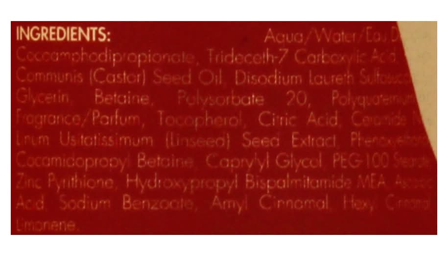 Ingredients: Aqua/Water/Eau, Disodium Cocoamphodipropionate, Trideceth-7 Carboxylic Acid, Ricinus Communis (Castor) Seed Oil, Disodium Laureth Sulfosuccinate, Glycerin, Betaine, Polysorbate 20, Polyquaternium-10, Fragrance/Parfum, Tocopherol, Citric Acid, Ceramide Ng, Linum Usitatissimum (Linseed) Seed Extract, Phenoxyethanol, Cocamidopropyl Betaine, Caprylyl Glycol, PEG-100 Stearate, Zinc Pyrithione, Hydroxypropyl Bispalmitamide MEA, Ascorbic Acid, Sodium Benzoate, Amyl Cinnamal, Hexyl Cinnamal, Limonene Contains: 'Free From Gluten'
