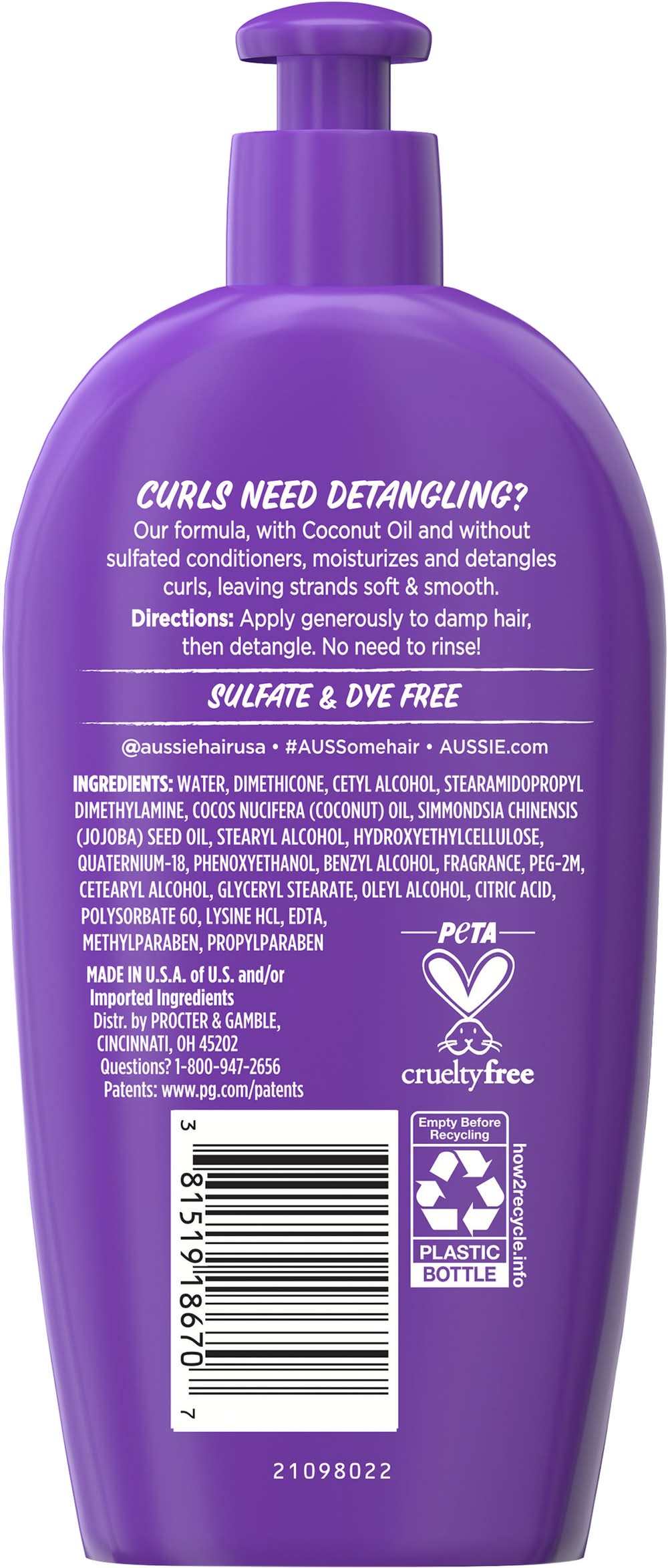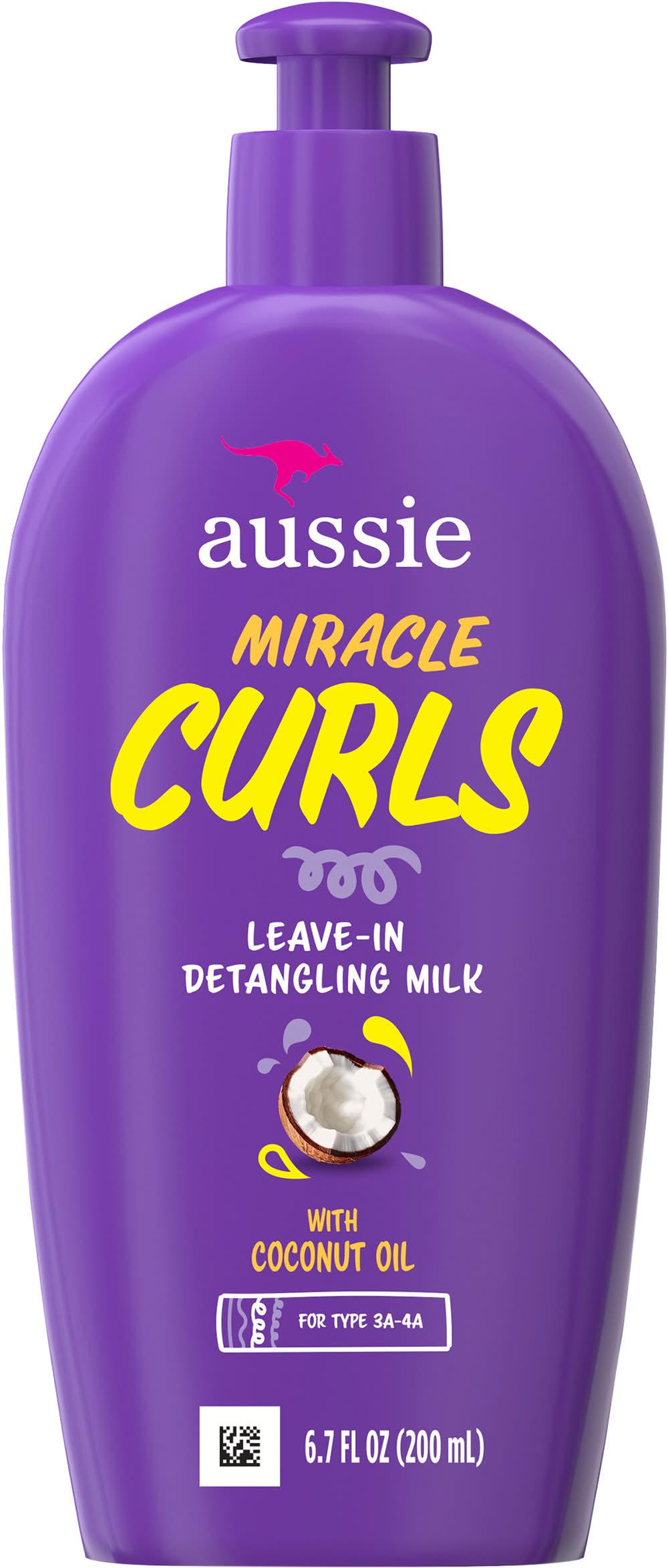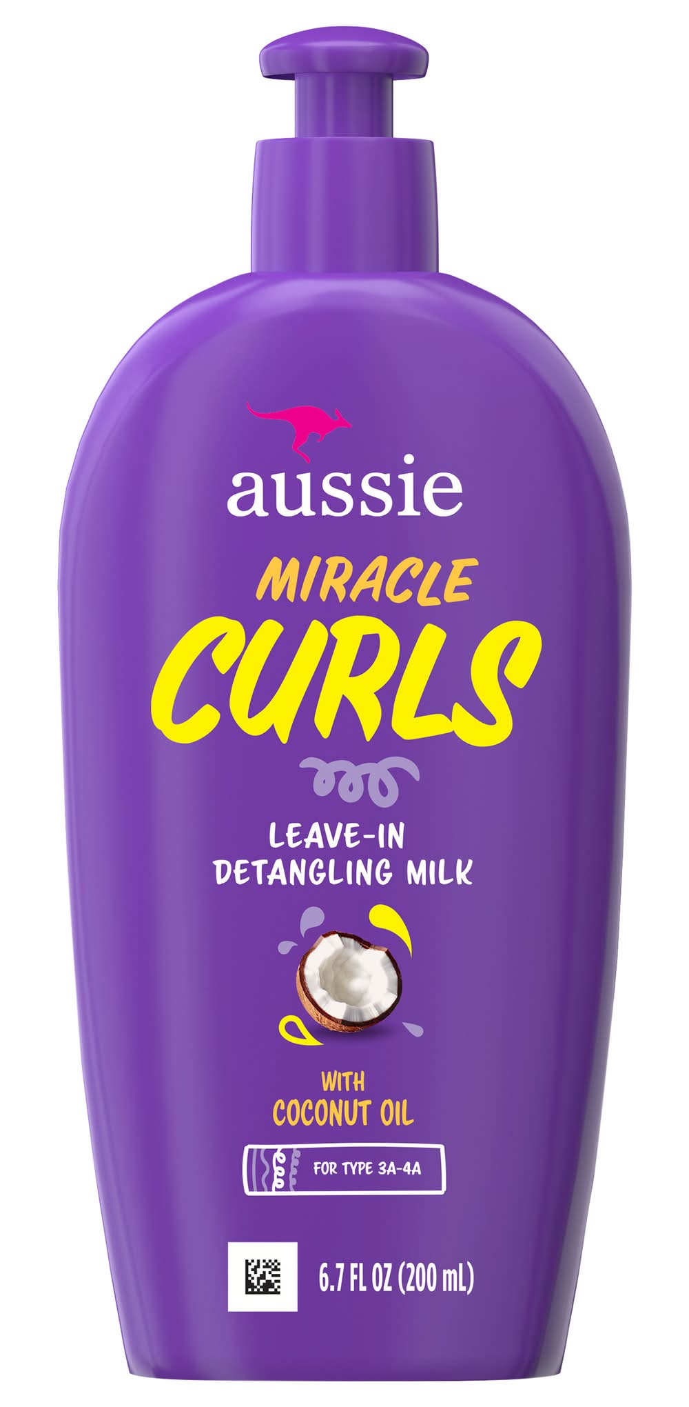 TANGLES? KNOT HERE! Aussie Miracle Curls Detangling Milk tames frizz and keeps gnarly knots at bay. Infused with coconut and jojoba oil, this nourishing leave-in conditioner smooths and softens strands, leaving behind a luscious strawberry and pomegranate scent. Simply apply to damp hair, detangle and let air dry. Procter & Gamble, Cincinnati, OH, 45202