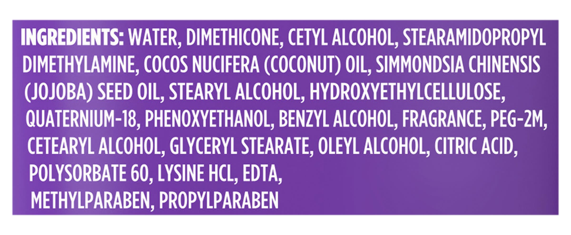 Ingredients: Water, Dimethicone, Cetyl Alcohol, Stearamidopropyl Dimethylamine, Cocos Nucifera (Coconut) Oil, Simmondsia Chinensis (Jojoba) Seed Oil, Stearyl Alcohol, Hydroxyethylcellulose, Quaternium-18, Phenoxyethanol, Benzyl Alcohol, Fragrance, PEG-2M, Cetearyl Alcohol, Glyceryl Stearate, Oleyl Alcohol, Citric Acid, Polysorbate 60, Lysine HCl, EDTA, Methylparaben, Propylparaben Contains: Tree Nuts, coconuts