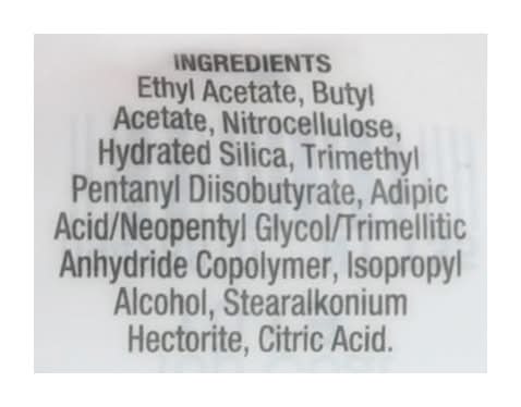 Ingredients: Butyl Acetate, Ethyl Acetate, Nitrocellulose, Hydrated Silica, Trimethyl Pentanyl Diisobutyrate, Adipic Acid/Neopentyl Glycol/Trimellitic Anhydride Copolymer, Isopropyl Alcohol, Stearalkonium Hectorite, Citric Acid
