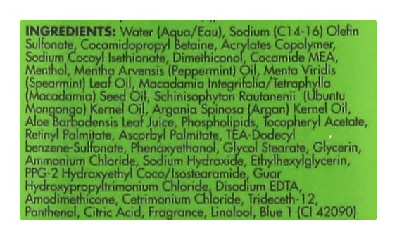 Ingredients: Water (Aqua/Eau), Sodium (C 14-16) Olefin Sulfonate, Cocamidopropyl Betaine, Acrylates Copolymer, Sodium Cocoyl Isethionate, Dimethiconol, Cocamide MEA, Menthol, Mentha Arvensis (Peppermint) Oil, Menta Viridis (Spearmint) Leaf Oil, Macadamia Integrifolia/Tetraphylla (Macadamia) Seed Oil, Schinisophyton Routanenii (Ubuntu Mongongo), Kernel Oil, Argania Spinosa [Argan] Kernel Oil, Aloe Barbadensis Leaf Juice, Phospholipids, Tocopheryl Acetate, Retinyl Palmitate, Ascorbyl Palmitate, TEA-Dodecyl Benzene-Sulfonate, Phenoxyethanol, Glycol Stearate, Glycerin, Ammonium Chloride, Sodium Hydroxide, Ethylhexylglycerin, PPG-2 Hydroxyethyl Coco/Isostearamide, Guar Hydroxypropyltrimonium Chloride, Disodium EDTA, Amodimethicone, Cetrimonium Chloride, Trideceth-12, Panthenol, Citric Acid, Fragrance, Linalool, Blue 1 (CI 42090) Contains: Tree Nuts
