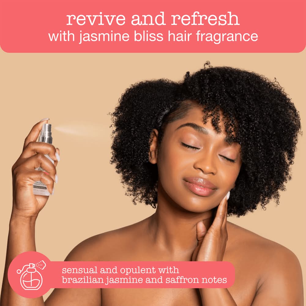 Our Jasmine Bliss hair fragrance is formulated to give hair long-lasting scent with an aroma infused with an irresistible trail of Brazilian jasmine and Kashmir saffron notes. It’s a signature scent that also gives UV protection. Size: 5