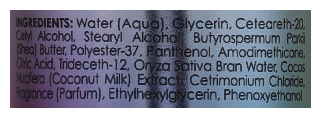 Ingredients: Water (Aqua), Glycerin, Ceteareth-20, Cetyl Alcohol, Stearyl Alcohol, Butyrospermum Parkii (Shea) Butter, Polyester-37, Panthenol, Amodimethicone, Citric Acid, Trideceth-12, Oryza Sativa Bran Water, Cocos Nucifera (Coconut Milk) Extract, Cetrimonium Chloride, Fragrance (Parfum), Ethylhexylglycerin, Phenoxyethanol Contains: Tree Nuts, Coconuts, Tree Nuts, Sheanuts, Milk