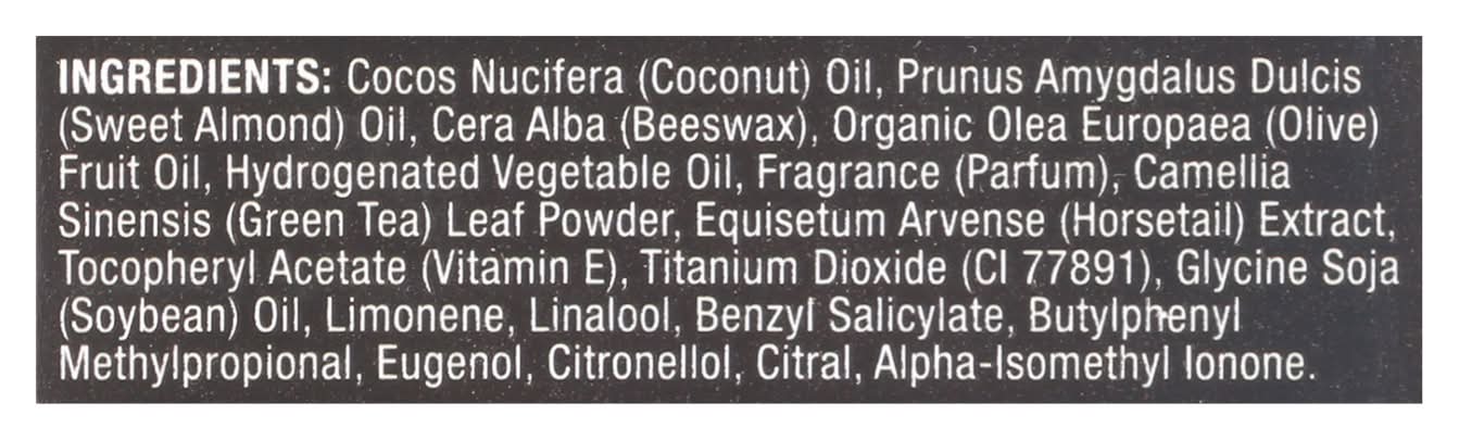 Ingredients: Cocos Nucifera (Coconut) Oil, Prunus Amygdalus Dulcis (Sweet Almond) Oil, Cera Alba (Beeswax), Organic Olea Europaea (Olive) Fruit Oil, Hydrogenated Vegetable Oil, Fragrance (Parfum), Camellia Sinensis (Green Tea) Leaf Powder, Equisetum Arvense (Horsetail) Extract, Tocopheryl Acetate (Vitamin E), Titanium Dioxide (CI 77891), Glycine Soja (Soybean) Oil, Limonene, Linalool, Benzyl Salicylate, Butylphenyl Methylpropional, Eugenol, Citronellol, Citral, Alpha-Isomethyl Lonone Contains: Tree Nuts, Soybeans