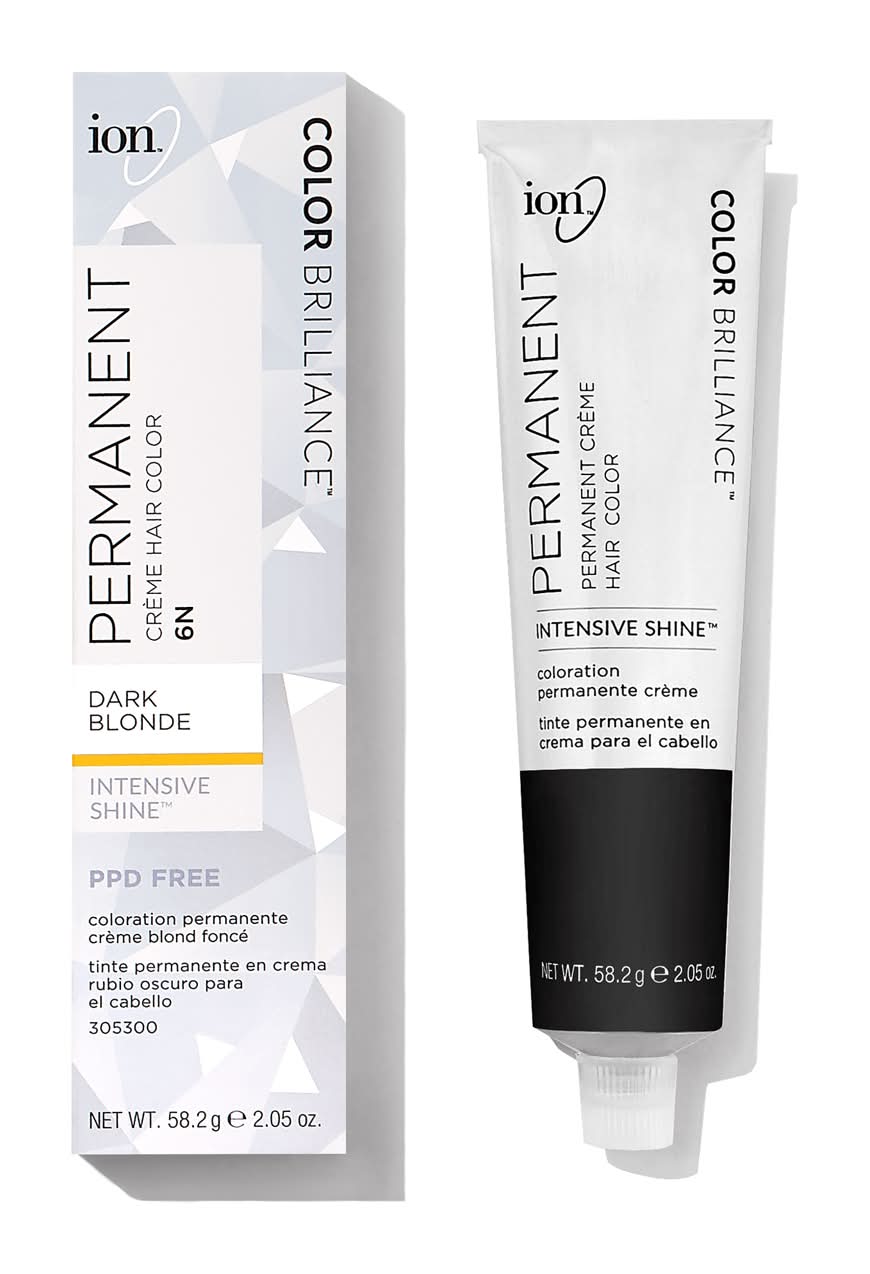 ion Color Brilliance Permanent Creme Hair Color has a palette of luxurious shades. The advanced ionic technology utilizes pure ionic micro pigments for deeper, more intense color deposit. ion Color Brilliance penetrates the cuticle layer of the hair and lodges in the cortex, ensuring 100% flawless gray coverage. High Lift shades lift up to 5 levels and tone without bleach. ion Hair Color’s superior quality, proprietary blends are formulated in Italy by our expert team of chemists to deliver unparalleled results. ion's unique system combines the finest quality natural and exotic ingredients with powerful high-tech compounds to achieve exquisite, brilliant color with superior gray coverage. ion Hair Color science relies on the power of micro-pigmentation — ion's microscopic pigment molecules oxidize slower, allowing them to penetrate deep into the cortex of each hair strand for long-lasting, fade-resistant color. These formulas are PPD free and enriched with hyaluronic acid, argan oil, pequi oil and botanicals to nourish and strengthen hair from within. Not to mention, ion Hair Color is gentle on hair, containing up to 38% less ammonia than the leading professional brands on the market. Unlock your hair’s true potential with ion’s cutting-edge, salon-quality color science, and bring hom... • Color: 6n dark blonde • Size: 2.05