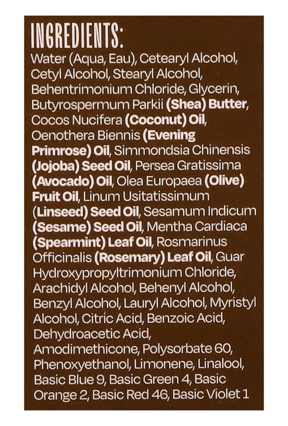 Ingredients: Water (Aqua, Eau), Cetearyl Alcohol, Cetyl Alcohol, Stearyl Alcohol, Behentrimonium Chloride, Glycerin, Butyrospermum Parkii (Shea) Butter, Cocos Nucifera (Coconut) Oil, Oenothera Biennis (Evening Primrose) Oil, Simmondsia Chinensis (Jojoba) Seed Oil, Persea Gratissima (Avocado) Oil, Olea Europaea (Olive) Fruit Oil, Linum Usitatissimum (Linseed) Seed Oil, Sesamum Indicum (Sesame) Seed Oil, Mentha Cardiaca (Spearmint) Leaf Oil, Rosmarinus Officinalis (Rosemary) Leaf Oil, Guar Hydroxypropyltrimonium Chloride, Arachidyl Alcohol, Behenyl Alcohol, Benzyl Alcohol, Lauryl Alcohol, Myristyl Alcohol, Citric Acid, Benzoic Acid, Dehydroacetic Acid, Amodimethicone, Polysorbate 60, Phenoxyethanol, Limonene, Linalool, Basic Blue 9, Basic Green 4, Basic Orange 2, Basic Red 46, Basic Violet 1 Contains: Tree Nuts, Sheanuts, Tree Nuts, Coconuts, Sesame