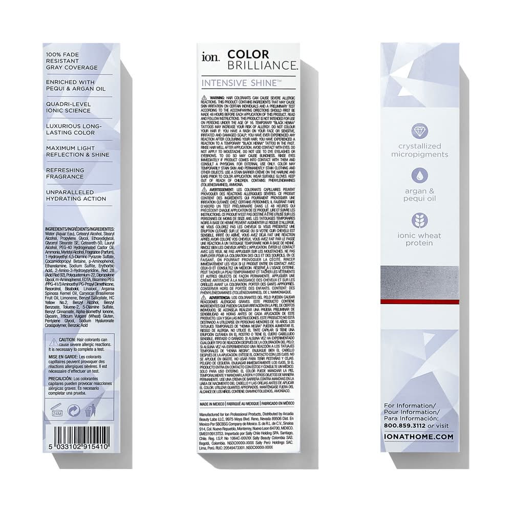 The advanced ionic technology utilizes pure ionic micro pigments for deeper, more intense color deposit. ion Color Brilliance penetrates the cuticle layer of the hair and lodges in the cortex, ensuring 100% flawless gray coverage. High Lift shades lift up to 5 levels and tone without bleach. ion Hair Color’s superior quality, proprietary blends are formulated in Italy by our expert team of chemists to deliver unparalleled results. ion's unique system combines the finest quality natural and exotic ingredients with powerful high-tech compounds to achieve exquisite, brilliant color with superior gray coverage. ion Hair Color science relies on the power of micro-pigmentation — ion's microscopic pigment molecules oxidize slower, allowing them to penetrate deep into the cortex of each hair strand for long-lasting, fade-resistant color. These formulas are PPD free and enriched with hyaluronic acid, argan oil, pequi oil and botanicals to nourish and strengthen hair from within. • Color: 7ir medium intense red blonde • Size: 2.05 • Packaging: Reusable