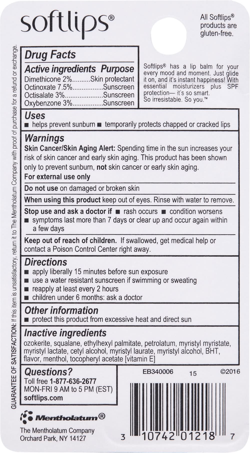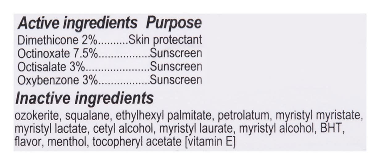 Ingredients: Active Ingredients: Dimethicone 2%, Octinoxate 7.5%, Octisalate 3%, Oxybenzone 3%. Purposes: Skin Protectant, Sunscreen, Sunscreen, Sunscreen. Inactive Ingredients: Ozokerite Additives: Ozokerite, Squalane, Ethylhexyl Palmitate, Petrolatum, Myristyl Myristate, Myristyl Lactate, Flavor, Cetyl Alcohol, Myristyl Laurate, Myristyl Alcohol, BHT, Menthol, Tocopheryl Acetate [Vitamin E].