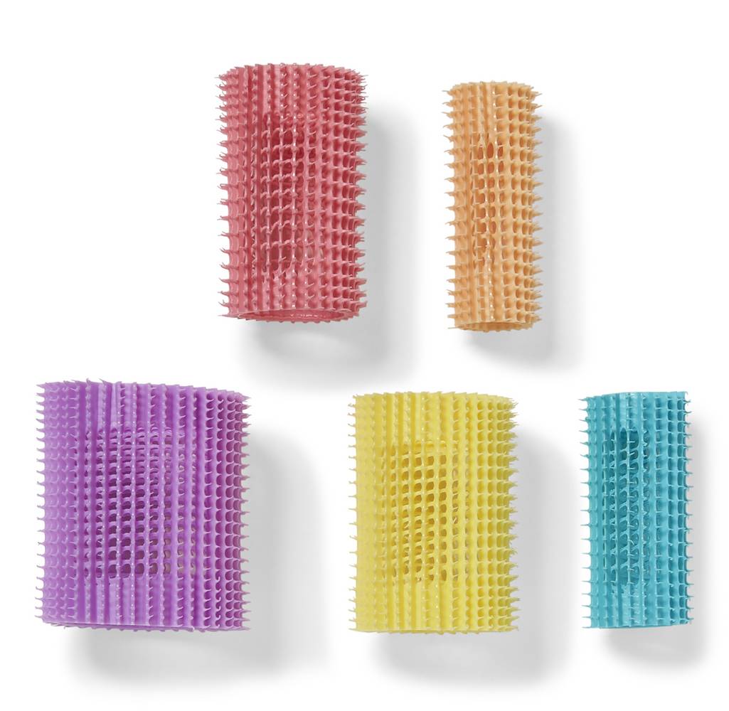 An assortment of self-gripping curlers packaged in a travel-friendly, clear, zippered bag with handle. Kit includes: 5 orange curlers, 3 green curlers, 5 pink curlers, 3 yellow curlers, and 5 purple curlers