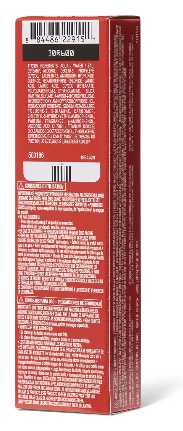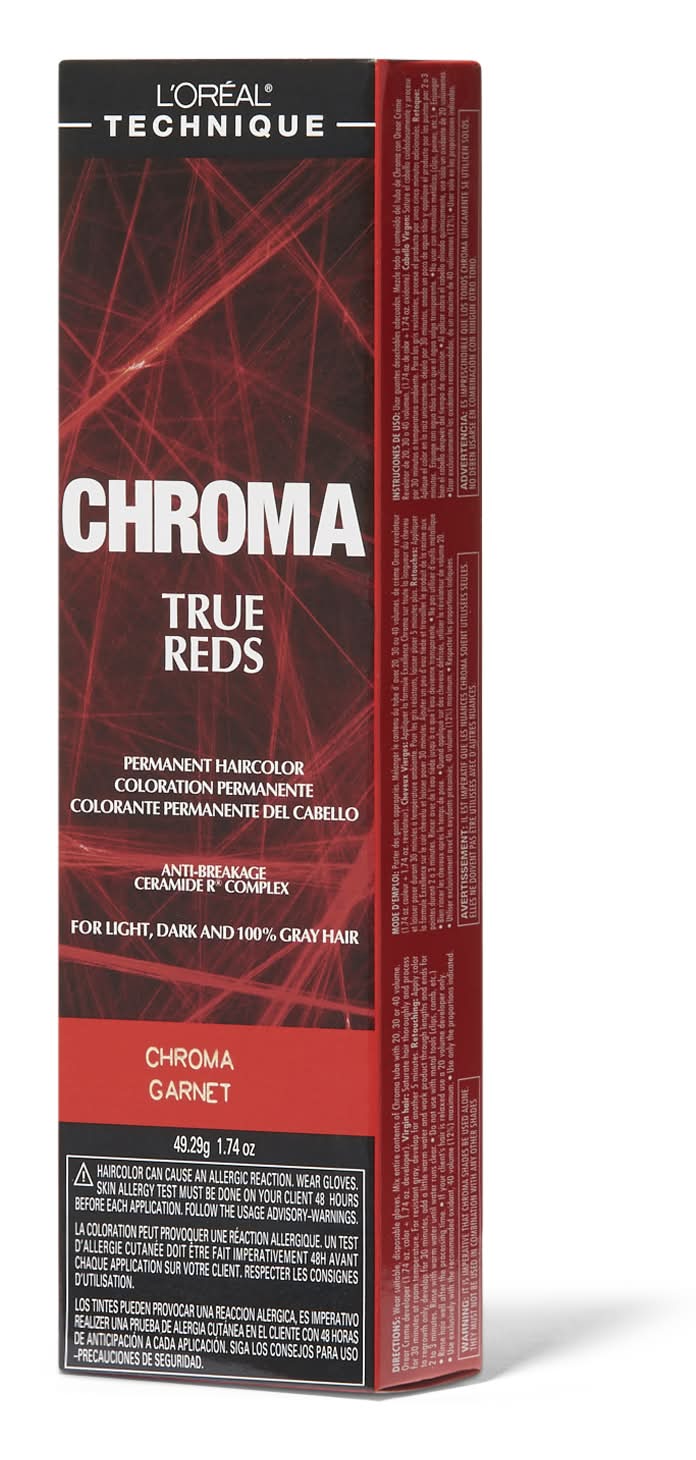 These collection utilizes a unique red dye technology for Technique that delivers key benefits to customers looking for beautiful red hair color. This permanent hair color has been formulated with Anti-Breakage Ceramide R Complex which penetrates the hair's cortex to condition and help protect against breakage. CHROMA True Reds are long-lasting. After repeated shampooing, color stays deep and true without shifting tone. CHROMA True Reds features unique red hues for L'Oreal Technique; high intensity deep garnet and deep red color shades. They are suitable for use on all bases of hair, light, dark and 100% gray delivering identifiable red color results on all natural levels of hair. In addition, True Reds provides excellent gray coverage with deep color and highlights on high percentages of gray hair. • Color: 4rv chroma garnet • Size: 1.74