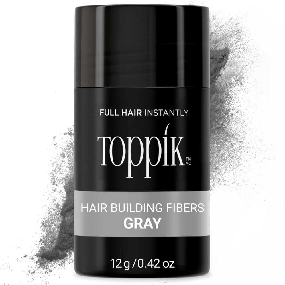 Toppik Hair Building Fibers, made of colored keratin protein, blend undetectably with existing hair strands to instantly create the appearance of naturally thick, full hair. Ideal for men and women with thinning hair, these fibers offer weather resistance and long-lasting results. Toppik Hair Fibers will stay in place until you wash your hair. Toppik is the #1 Hair Fiber among hair care products. • Color: Gray • Size: 0.42