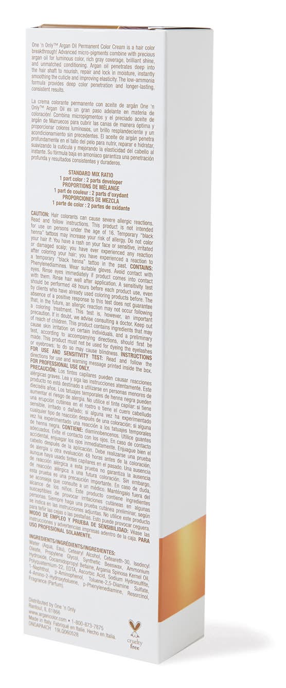 One ‘n Only Argan Oil Permanent Color cream is a hair color breakthrough! Advanced micro pignments combine with precious argan oil for luminous color, rich gray coverage, brilliant shine, and unmatched conditioning. Argan oil penetrates deep into the hair shaft to nourish, repair and lock in moisture, instantly smoothing the cuticle and improving elasticity. The low-ammonia formula provides deep color penetration and longer-lasting, consistent results. • Color: 4ch medium chocolate brown • Size: 3