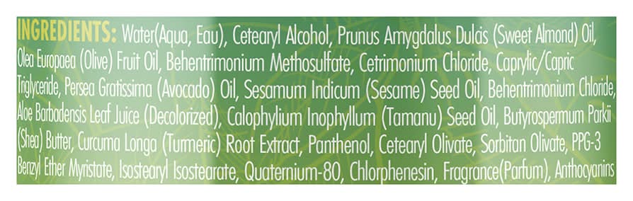 Ingredients: Water(Aqua, Eau), Cetearyl Alcohol, Prunus Amygdalus Dulas (Sweet Almond) Oil, Olea Europaea (Olive) Fruit Oil, Behentrimonium Methosulfate, Cetrimonium Chloride, Caprylic/Capric Triglyceride, Persea Gratissima (Avocado) Oil, Sesamum Indicum (Sesame) Seed Oil, Behentrimonium Chloride, Aloe Barbadensis Leaf Juice (Decolorized), Calophylium Inophyllum (Tamanu) Seed Oil, Butyrospermum Parki (Shea) Butter, Curcuma Longa (Turmeric) Root Extract, Panthenol, Cetearyl Olivate, Sorbitan Olivate, PPG-3 Benzyl Ether Myristate, Isostearyl Isostearate, Quaternium-80, Chlorphenesin, Fragrance(Parfum), Anthocyanins Contains: Tree Nuts, Almonds, Sesame