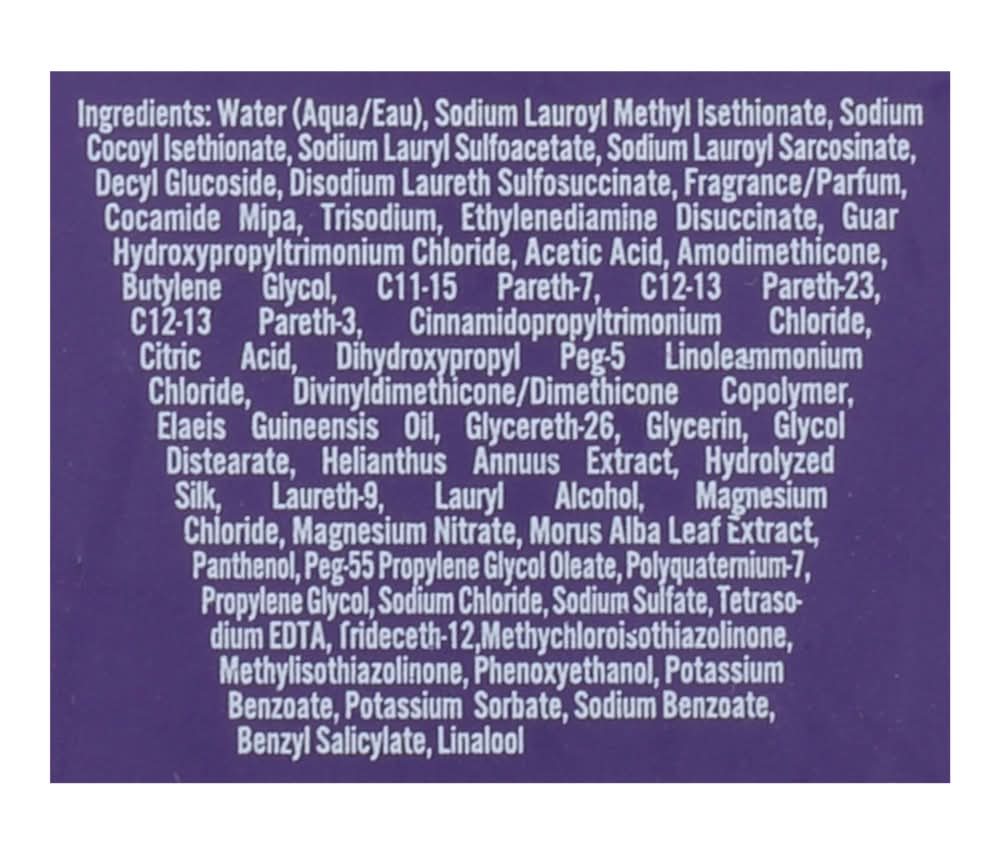 Ingredients: Water (Aqua/Eau), Sodium Lauroyl Methyl Isethionate, Sodium Cocoyl Isethionate, Sodium Lauryl Sulfoacetate, Sodium Lauroyl Sarcosinate, Decyl Glucoside, Disodium Laureth Sulfosuccinate, Fragrance/Parfum, Cocamide Mipa, Trisodium, Ethylenediamine Disuccinate, Guar Hydroxypropyltrimonium Chloride, Acetic Acid, Amodimethicone, Butylene Glycol, C11-15 Pareth-7, C12-13 Pareth-23, C12-13 Pareth-3, Cinnamidopropyltrimonium Chloride, Citric Acid, Dihydroxypropyl PEG-5 Linoleammonium Chloride, Divinyldimethicone/Dimethicone Copolymer, Elaeis Guineensis Oil, Glycereth-26, Glycerin, Glycol Distearate, Helianthus Annuus Extract, Hydrolyzed Silk, Laureth-9, Lauryl Alcohol, Magnesium Chloride, Magnesium Nitrate, Morus Alba Leal Extract, Panthenol, PEG-55 Propylene Glycol Oleate, Polyquaternium-7, Propylene Glycol, Sodium Chloride, Sodium Sulfate, Tetrasodium EDTA, Trideceth-12, Methylchloroisothiazolinone, Methylisothiazolinone, Phenoxyethanol, Potassium Benzoate, Potassium Sorbate, Sodium Benzoate, Benzyl Salicylate, Linalool