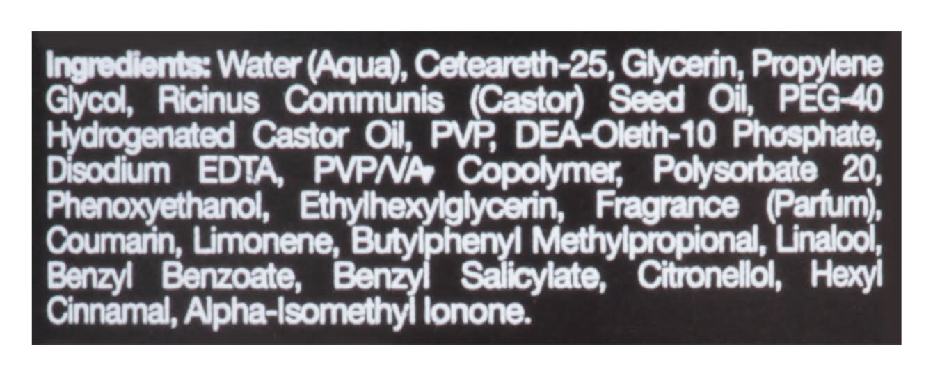 Ingredients: Water (Aqua), Ceteareth-25, Glycerin, Propylene Glycol, Ricinus Communis (Castor) Seed Oil, PEG-40 Hydrogenated Castor Oil, PVP, DEA-Olet-10 Phosphate, Disodium EDTA, PVP/VA Copolymer, Polysorbate 20, Phenoxyethanol, Ethylhexylglycerin, Fragrance (Parfum), Coumarin, Limonene, Butylphenyl Methylpropional, Linalool, Benzyl Benzoate, Benzyl Salicylate, Citronellol, Hexyl Cinnamal, Alpha-Isomethyl Lonone
