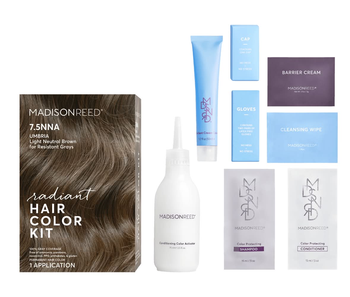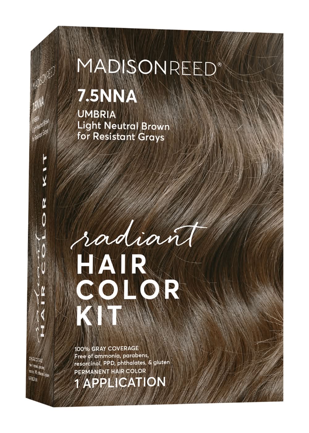 Madison Reed Radiant Hair Color Kit delivers gorgeous, multi-dimensional, salon-quality hair color with 100% gray coverage. Made with ingredients you can feel good about, this is the first ever Smart 8-Free permanent hair color, free of ammonia, parabens, resorcinol, PPD, phthalates, gluten, SLS, and titanium dioxide. Enriched with hair-loving nutrients keratin, argan oil, and ginseng root extract to protect and pamper your hair. For best results, stay within two shades of your natural color. Radiant Hair Color Kit includes: Radiant Cream Color, Conditioning Color Activator, 2 Pairs of Gloves, Cap, Barrier Cream, Cleansing Wipe, Color Protecting Shampoo and Conditioner Pro tip: When coloring your roots, pair with Madison Reed Color Reviving Gloss to add brilliant shine to your mid-lengths and ends Color: 7.5nna umbria light brown