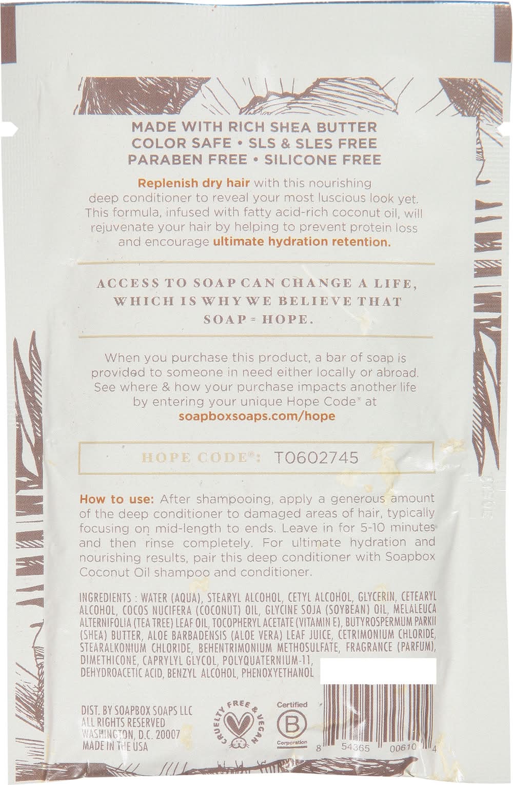 How to use: after shampooing, apply a generous amount of the deep conditioner to damaged areas of hair, typically focusing on mid-length to ends. leave in for 5-10 minutes and then rinse completely. for ultimate hydration and nourishing results, pair this deep conditioner with soapbox coconut oil shampoo and conditioner.