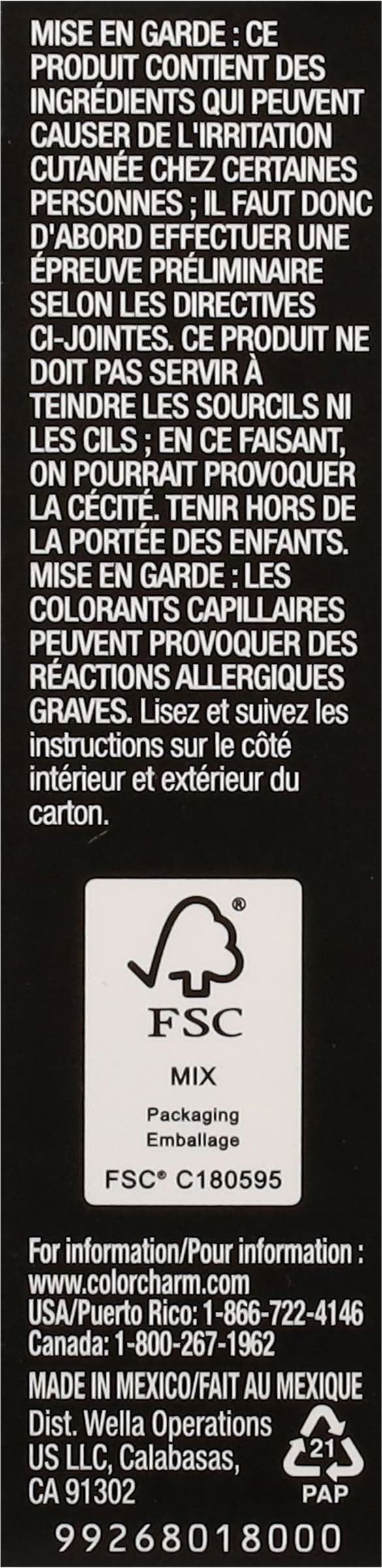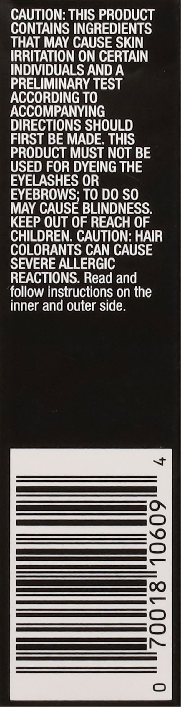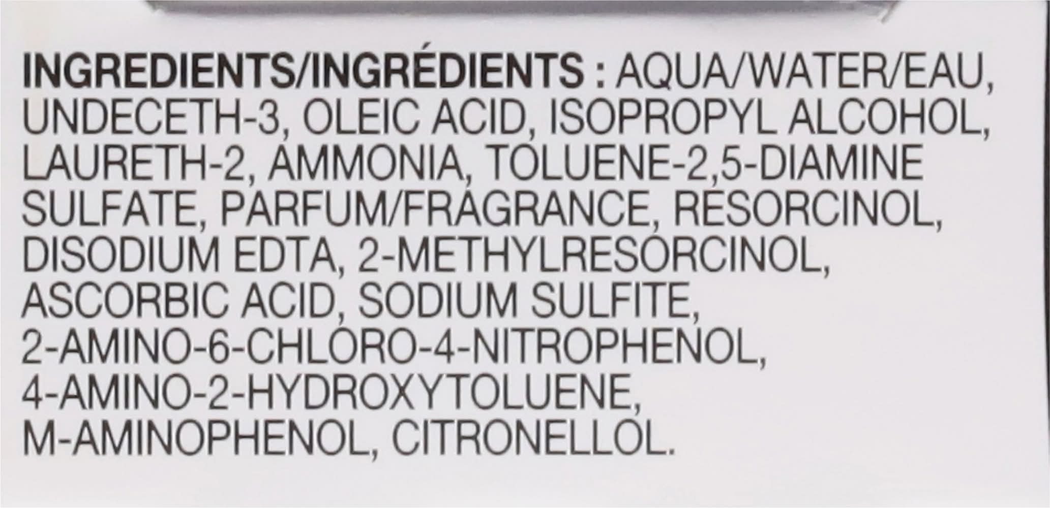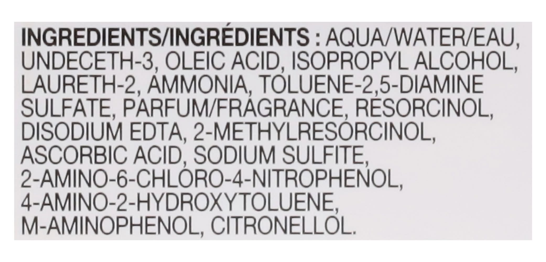 Ingredients: Aqua/Water/Eau, Undeceth-3, Oleic Acid, Isopropyl Alcohol, Laureth-2, Ammonia, Toluene-2.5-Diamine Sulfate, Parfum/Fragrance, Resorcinol, Disodium EDTA, 2-Methylresorcinol, Ascorbic Acid, Sodium Sulfite, 2-Amino-6-Chloro-4-Nitrophenol, 4-Amino-2-Hydroxytoluene, M-Aminophenol, Citronellol Contains: Sulfites