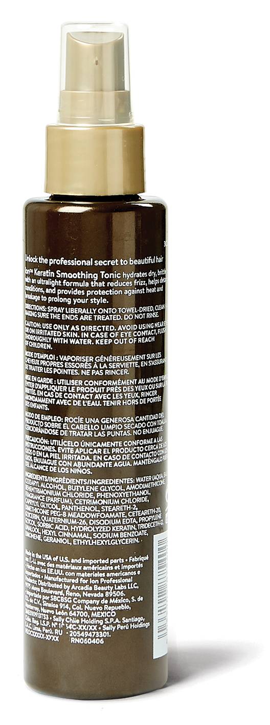 Unlock the professional secret to beautiful hair. Ion Smoothing Keratin Frizz Fighting Tonic hydrates dry brittle hair with an ultra-light formula that reduces frizz, helps detangle, conditions, and provides protection against heat and breakage to prolong your style.