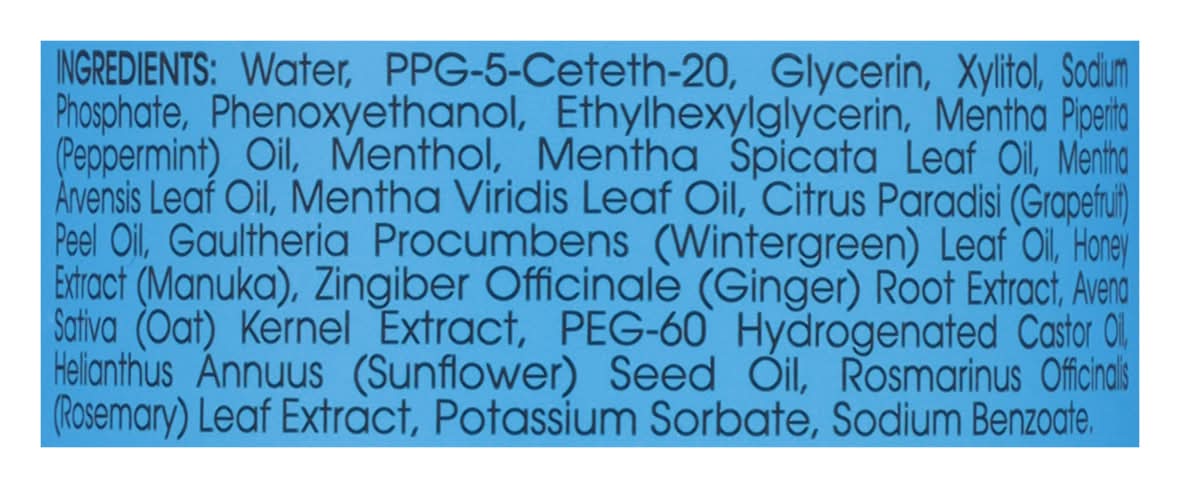 Ingredients: Water, PPG-5-Ceteth-20, Glycerin, Xylitol, Sodium Phosphate, Phenoxyethanol, Ethylhexylglycerin, Mentha Piperita (Peppermint) Oil, Menthol, Mentha Spicata Leaf Oil, Mentha Arvensis Leaf Oil, Mentha Viridis Leaf Oil, Citrus Paradisi (Grapefruit) Peel Oil, Gaultheria Procumbens (Wintergreen) Leaf Oil, Honey Extract (Manuka), Zingiber Officinale (Ginger) Root Extract, Avena Sativa (Oat) Kernel Extract, PEG-60 Hydrogenated Castor Oil, Helianthus Annuus (Sunflower) Seed Oil, Rosmarinus Officinalis (Rosemary) Leaf Extract, Potassium Sorbate, Sodium Benzoate Contains: Oat