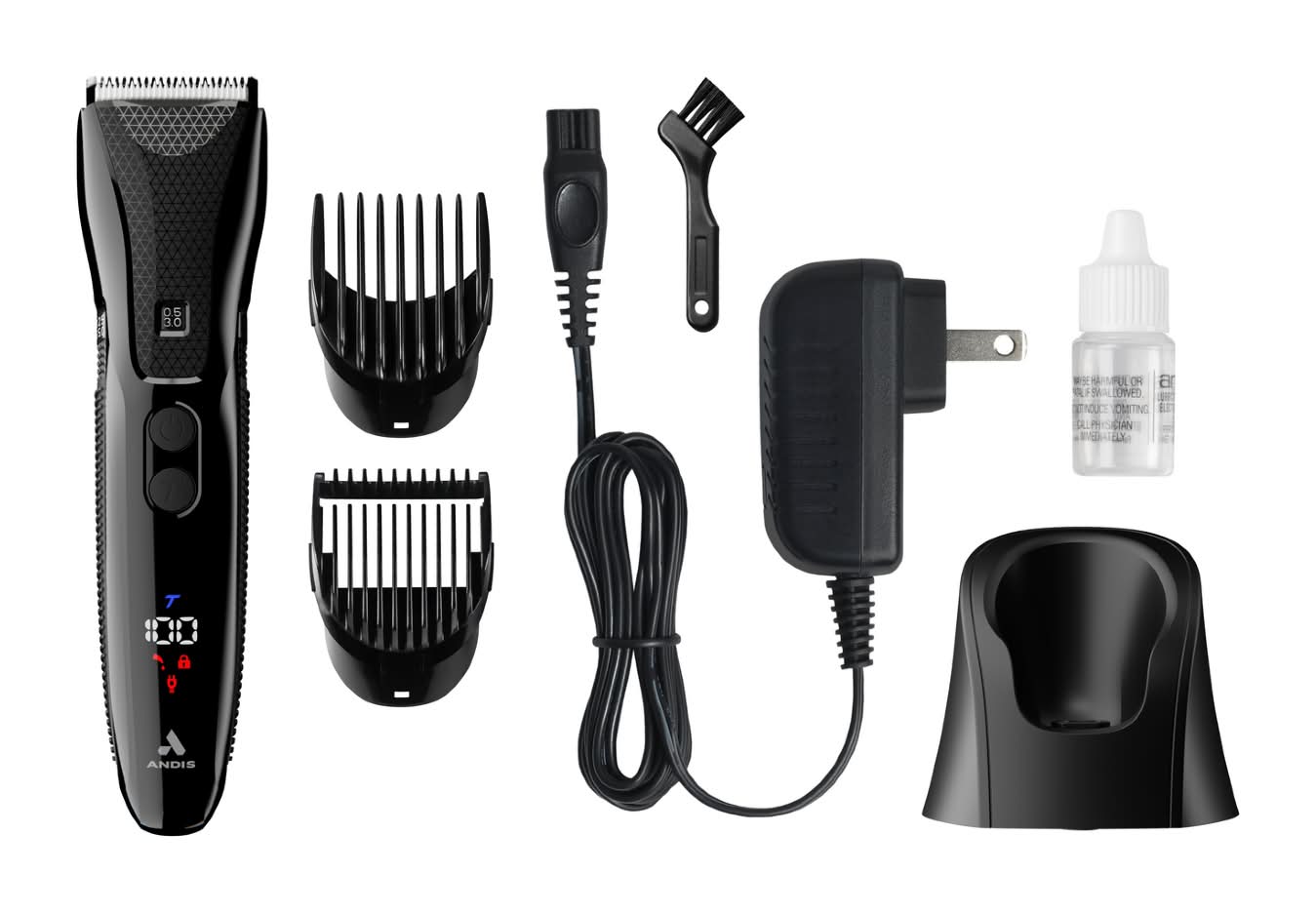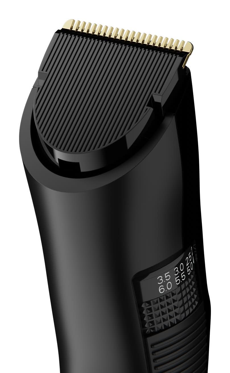 Kit includes trimmer, adjustable beard attachment comb, adjustable hair attachment comb, blade oil, blade cleaning brush, charging adapter, charging stand.